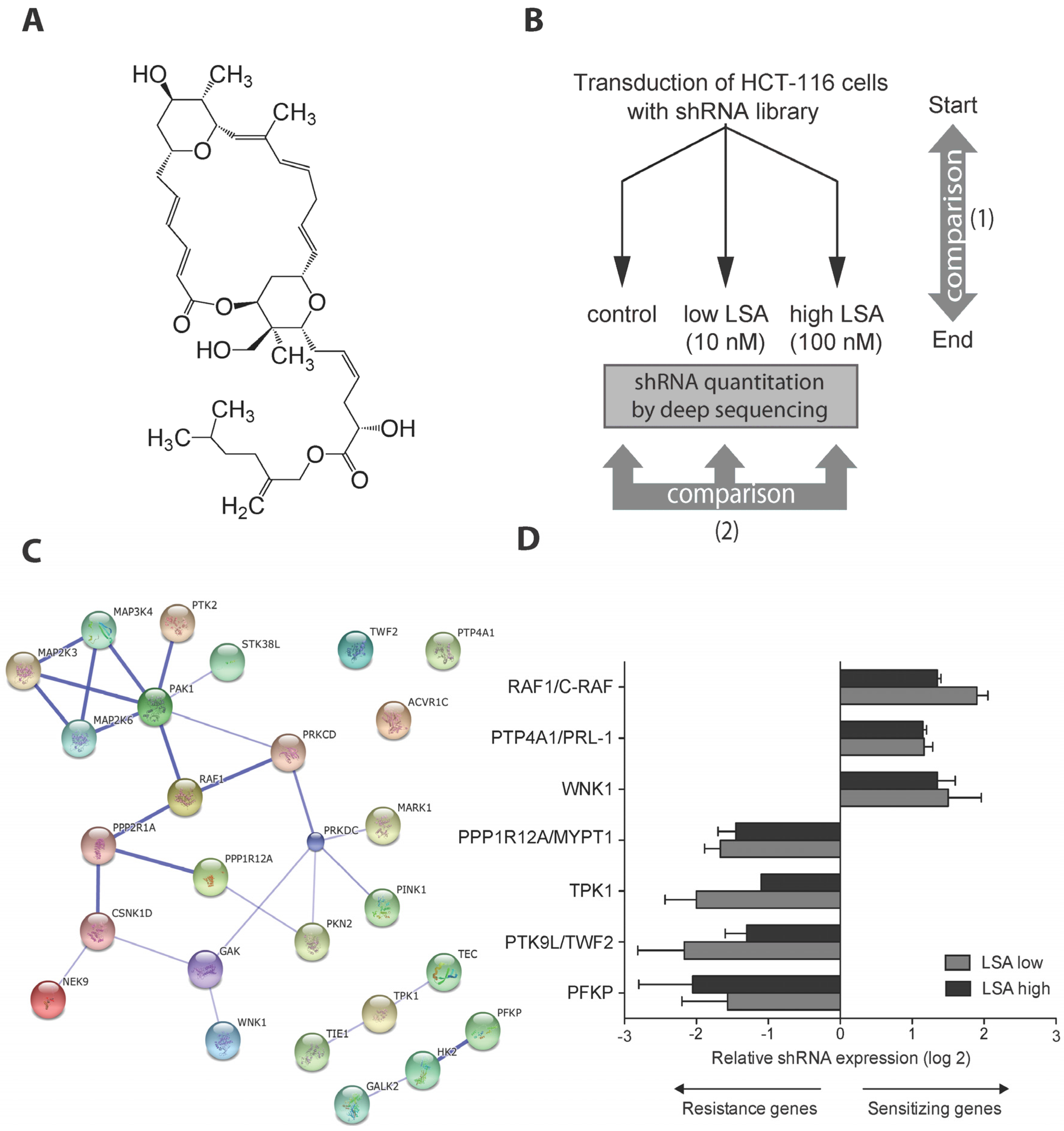 shRNA screen for genetic determinants of lasonolide A (LSA) sensitivity. (A) Chemical structure of LSA; (B) Scheme of the shRNA screen aiming to identify genes that modulate LSA sensitivity. A pooled retroviral shRNA library directed against kinases and phosphatases was transduced into HCT-116 colorectal cancer cells. Cells were cultured in the absence (control) or presence of LSA at two concentrations, 10 nM for 24 days or 100 nM for 14 days, respectively. Library compositions in starting and end samples were deconvoluted by deep sequencing to identify shRNAs that selectively dropped out or enriched in the LSA-treated samples; (C) Top candidates are enriched in known protein-protein interactions as determined by STRING; (D) shRNAs that enriched and dropped out selectively in the LSA treated samples. Results are expressed as the difference between the log2 ratio of (LSA/start) and the log2 ratio of (control/start). LSA low and high indicates the 10 nM and 100 nM treatment conditions, respectively. Genes whose shRNAs enriched with LSA treatment are potentially associated with LSA sensitivity, while genes whose shRNAs depleted with LSA treatment are potentially associated with resistance.