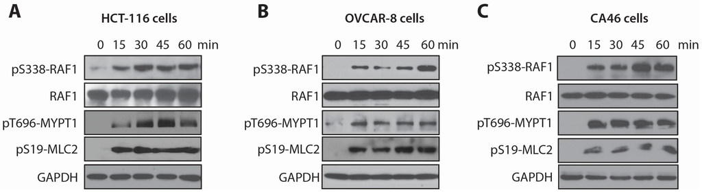 Phosphorylation of S338 plays a pivotal role for RAF1 activation [,]. To determine the role of RAF1 in the cellular effects of LSA, we measured the kinetics of RAF1 phosphorylation on S338 in three cell lines (Figure 2). These include the HCT-116 cell line we used for the shRNA screen, the ovarian cancer cell line OVCAR-8, which is wild-type for the RAS pathway [], and the Burkitt’s lymphoma cell line CA46, which we used in our initial study of LSA-induced PCC []. In all three-cell lines, LSA induced a marked phosphorylation of RAF1 within 15 min (Figure 2).
