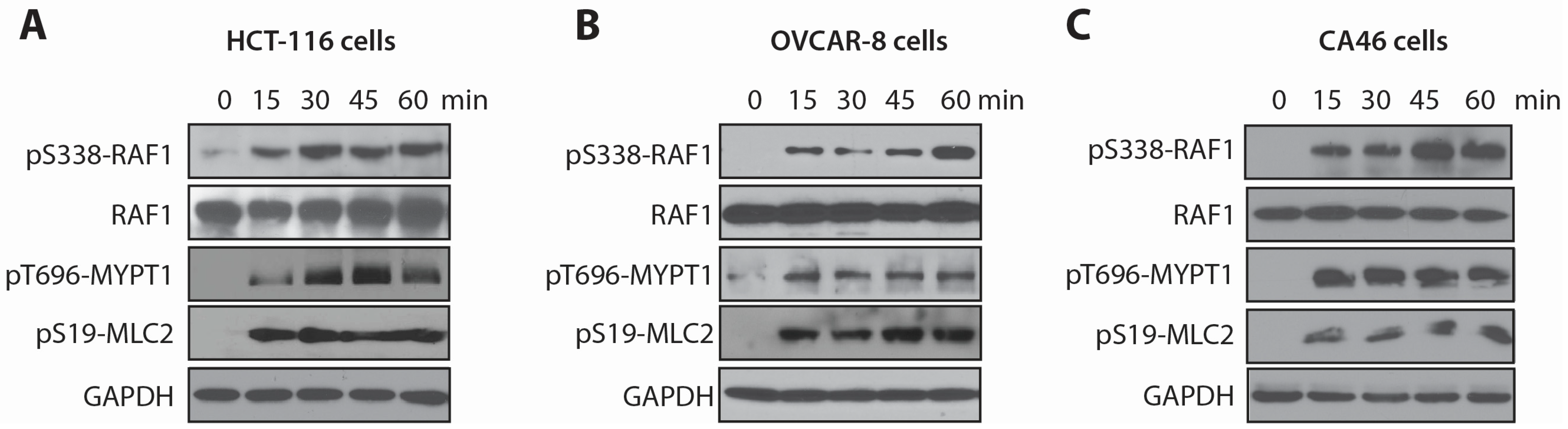 Phosphorylation of S338 plays a pivotal role for RAF1 activation [16,26]. To determine the role of RAF1 in the cellular effects of LSA, we measured the kinetics of RAF1 phosphorylation on S338 in three cell lines (Figure 2). These include the HCT-116 cell line we used for the shRNA screen, the ovarian cancer cell line OVCAR-8, which is wild-type for the RAS pathway [27], and the Burkitt’s lymphoma cell line CA46, which we used in our initial study of LSA-induced PCC [13]. In all three-cell lines, LSA induced a marked phosphorylation of RAF1 within 15 min (Figure 2).