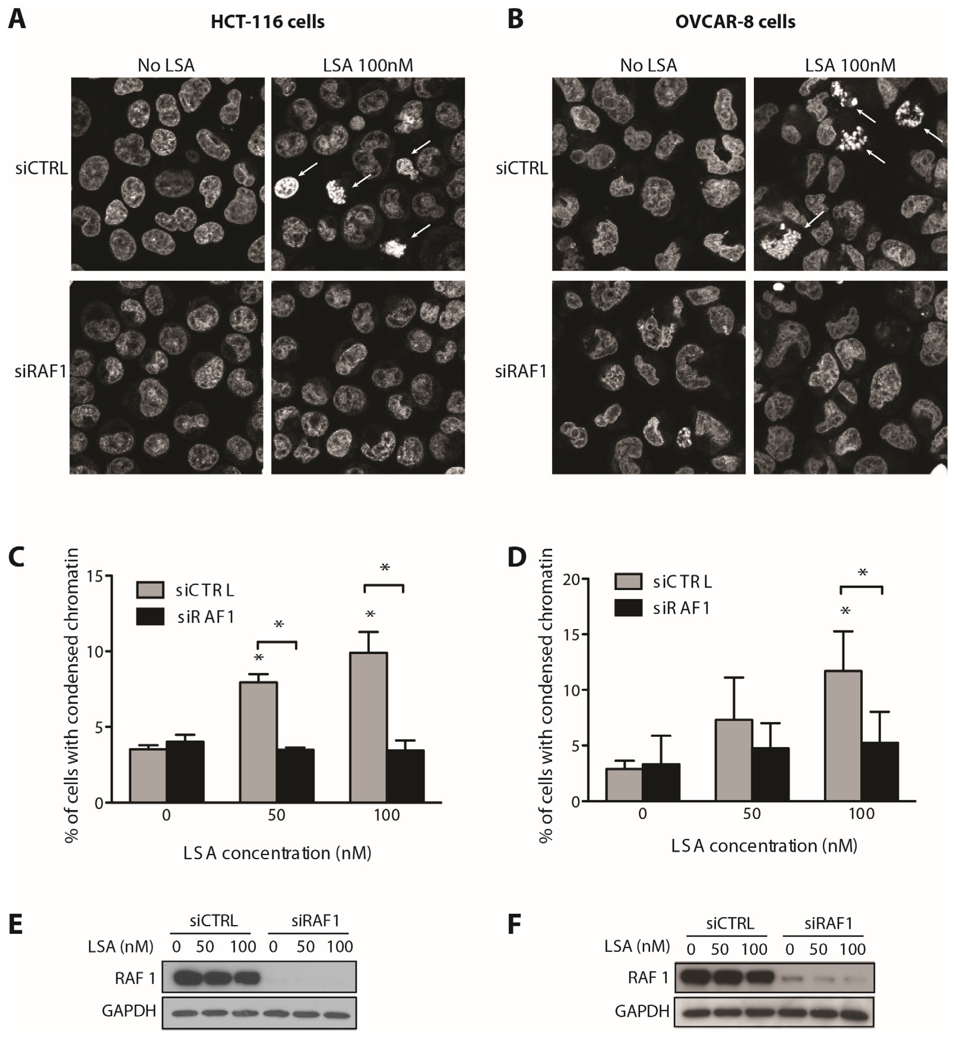 RAF1 is functionally required for LSA-induced premature chromosome condensation (PCC). (A,B) Representative images of PCC induced by LSA (100 nM, 30 min) in HCT-116 (A) and OVCAR-8 (B) cells. Cells were transduced with control or RAF1 siRNA 3 days prior to LSA treatment (100 nM, 30 min). Arrows indicate cells with PCC. DNA is visualized using propidium iodide; (C,D) Quantification of PCC induced by LSA (50 or 100 nM, 30 min) in HCT-116 (C) and OVCAR-8 (D) cells (results are mean ± SD of 3 independent experiments. * p < 0.01); (E,F) Immunoblots confirming knockdown of RAF1 in HCT-116 (E) and OVCAR-8 (F) cells.