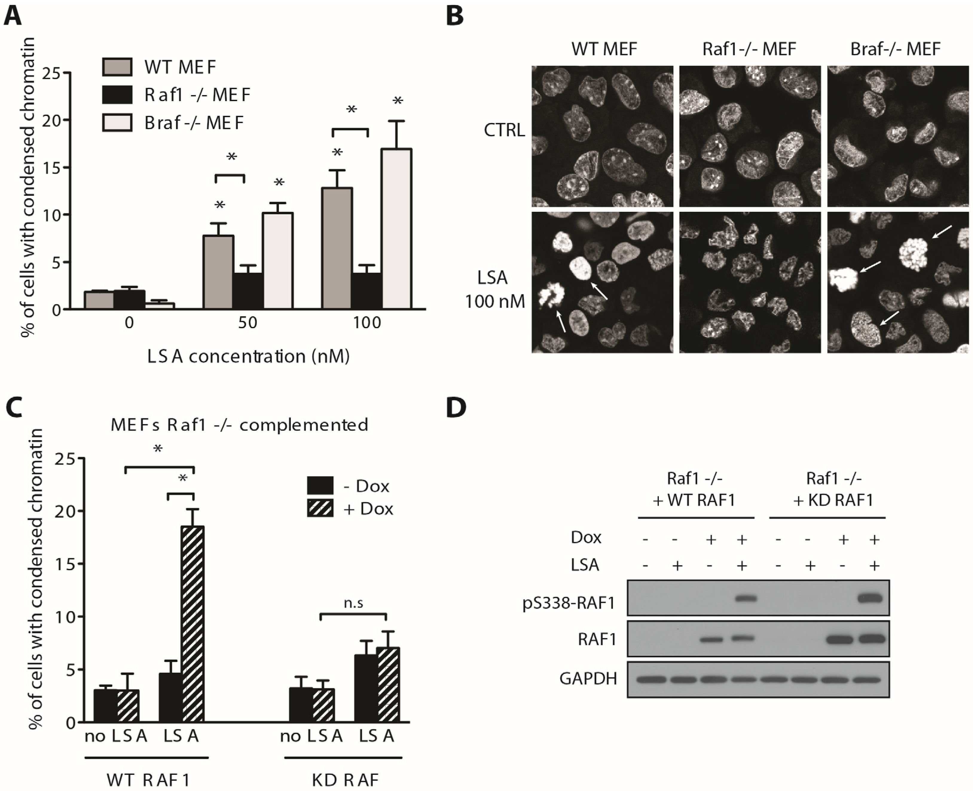 LSA-induced PCC requires RAF1 kinase activity but is not dependent on BRAF. (A) Relative PCC induced by LSA (100 nM, 30 min) in WT, Raf1−/− and Braf−/− mouse embryonic fibroblasts (MEFs). Results are the mean ± SD of 3 independent experiments. * p < 0.01; (B) Representative images of PCC induced by LSA in WT, Raf1−/− and Braf−/− MEFs. Arrows indicate cells counted as PCC. DNA is visualized using propidium iodide; (C) Chromatin condensation induced by LSA (100 nM, 30 min) in Raf1−/− MEFs complemented with tetracycline-inducible WT or kinase dead (KD) human RAF1 cDNA. Cells were induced with doxycycline (Dox, 1 μg/mL for 24 h) prior to LSA treatment. Results are mean ± SD of 3 independent experiments. * p < 0.01; (D) Immunoblotting confirming the induction of WT or KD RAF1 by doxycycline.
