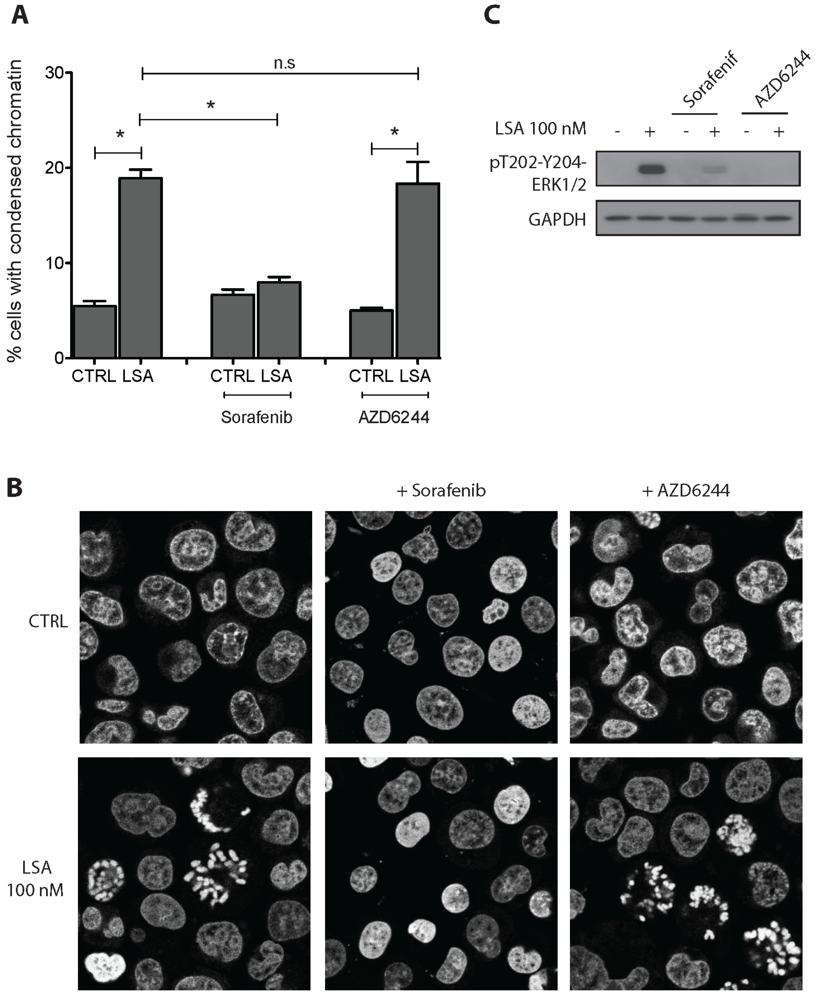 Pharmacological inhibition of RAF1, but not MEK1/2, reduced LSA-induced PCC. (A) PCC induced by LSA (100 nM) in HCT-116 cells pre-treated for 1 h with 10 μM of sorafenib or AZD6244 and then co-treated with LSA for 30 min. Results are the mean ± SD of 3 independent experiments. * p < 0.01; (B) Representative images of PCC induced by LSA with or without pre-treatment with sorafenib or AZD6244. DNA is visualized using propidium iodide; (C) Immunoblotting confirming the inhibition of ERK1/2 phosphorylation by AZD6244.