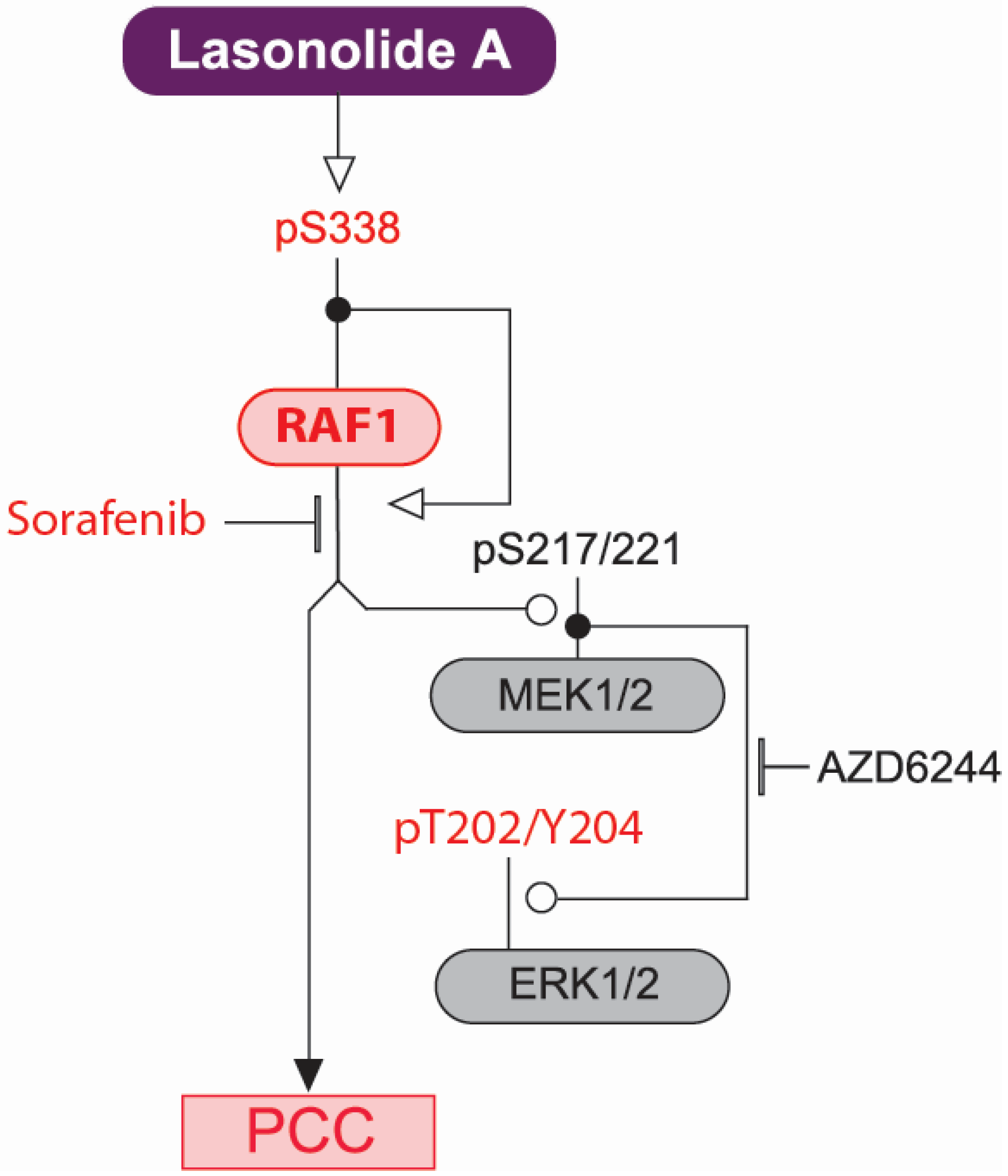 To elucidate the molecular target(s) of LSA and identify its mechanisms of action, we undertook a shRNA screening approach using a pooled library against kinases and phosphatases (1140 RefSeqs) [15]. This led to the identification of RAF1, a serine/threonine protein kinase that plays a key role in the Ras/MAPK signaling pathway. There are three RAF kinases in human, A-RAF, B-RAF and RAF1 (C-RAF) that are believed to play non-redundant roles. RAF kinases interact with activated Ras, which recruits RAF to the plasma membrane. This results in a multistep mechanism that activates RAF, and in the case of RAF1 it involves the phosphorylation of RAF1 on serine 338 and tyrosine 341 [16]. It has been shown that S338 phosphorylation on RAF1 is carried out via autophosphorylation and via phosphorylation by PAKs (p21-activated kinases) [17,18,19,20]. RAF kinases, in turn, activate the MEK/ERK cascade, which was recently found to be rapidly activated by LSA [12]. Although MEK kinases have been classically defined as the only RAF1 substrate, it is unclear whether RAF1 has MEK-independent kinase function. Our work demonstrates rapid and reversible RAF1 activation by LSA, and its implications in the induction of PCC by LSA.