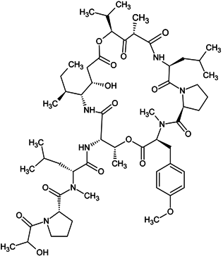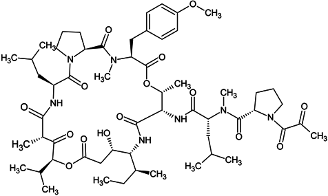 Kahalalide F is a cyclic tridecapeptide that contains several atypical amino-acid residues which showed antitumor activity. It was isolated from Elysia rufescens (a sea slug found in Hawaiian water) in 1993 [170]. However, later, it was found that the compound originated from the green alga Bryopsis sp., present in the sea slug’s diet [171]. It was active against human cancer cell lines [170,171] and several mechanisms of action have been proposed including an action on lysosomal membrane [172], inhibition of erbB2 tyrosine kinase activity [173], oncosis induction [174], effect on cell membrane permeability [175] and induction of necrosis-like cell death [176], yet no conclusive mechanism has been elucidated. Kahalalide F has entered into clinical trials for the treatment of patients with solid tumors including melanoma, non-small lung cancer and hepatocellular carcinoma [177,178], but the trials came to an end due to lack of antitumor activity. Yet, there is still interest in kahalalide F given that report of a recent investigation in advanced solid tumors therapy in phase I clinical trial has appeared [179]. Elisidepsin (PM02734 or known as Irvalec®) is a synthetic kahalalide F derivative which has similar action as kahalalide F. It manifests in vitro activity against a variety of tumor cell lines such as breast, colon, pancreas, prostate and lung [180,181,182] as well as in vivo activity in xenografted human tumors [183]. These results were promising and gave a rational basis for further investigations such as clinical studies of cancer treatment. A few clinical trials were submitted, they were the study of elisidepsin in patients with advanced solid tumor [184] and the study of combination therapy with erlotinib in patients with advanced malignant solid tumors. The two studies have been completed and the pharmaceutical company decided to suspend the development of elisidepsin in 2012 in view of commercial unviability of this product. However, a phase I study of combination therapy with carboplatin or gemcitabine in patients with advanced malignancies was initiated recently [185]. However the results did not show clinically significant antitumor activity, thus its development program may probably be deferred.