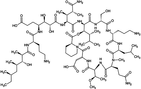 The polar fraction of the organic extract of the Red Sea sponge Theonella swinhoei, contained a bicyclic glycopeptide, theonellamide G. Theonellamide G exhibited strong antifungal activity toward wild and amphotericin B-resistant strains of Candida albicans with IC50 of 4.49 and 2.0 μM, respectively. It exerted cytotoxicity against the human colon adenocarcinoma cell line (HCT-16) with IC50 of 6.0 μM. These data furnish further information pertaining to the different chemical structures and bioactivities of this class of compounds [49]. The bacterium Bacillus amyloliquefaciens anti-CA isolated from mangrove system destroyed clinic strains of Candida albicans. The bacterial strain anti-CA produced elevated levels of bioactive substance, amylase and protease in the cheap medium containing 2.0% soybean meal, 2.0% wheat flour, pH 6.5 within 26 h. The active principle was a cyclic lipopeptide composed of a heptapeptide and a 15-carbon 3-hydroxy fatty acid. The lipopeptide also destroyed many yeast strains including C. albicans, C. tropicalis, Metschnikowia bicuspidata, Saccharomyces cerevisiae and Yarrowia lipolytica. Following exposure to the lipopeptide, both the entire cells and protoplasts of C. albicans were destroyed [50].