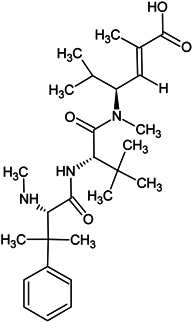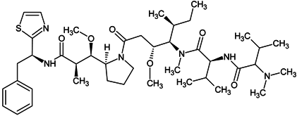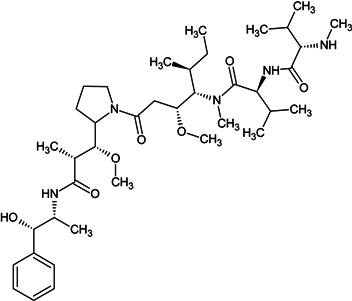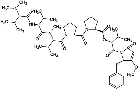 Brentuximab vedotin is an antibody-drug conjugate which targets on cell membrane protein CD30. It consists of (1) a chimeric monoclonal anti-CD30 antibody, brentuximab, linked to (2) a cathepsin-cleavable linker; (3) a para-aminobenzylcarbamate spacer and (4) monomethyl auristatin E (MMAE) which is a strong antimitotic agent. MMAE binds in the vicinity of the vinca peptide site, blocks microtubule assembly and tubulin polymerization [55]. It was approved by FDA in 2011 for treatment of Hodgkin and systemic anaplastic large cell lymphoma. The MMAE is a synthetic analog of dolastatin 10 isolated from Dolabella auricularia (sea hare found in the Indian Ocean). The extract from Dolabella auricularia was found to be highly efficacious against cancer cells as early as 1972. However, it was not until 1987 that the most potent constituent, dolastatin 10, was isolated and characterized. It is a linear pentapeptide with four distinctive amino acids and exhibited potent inhibitory activity against a battery of human cancer cell lines [145]. However, when it entered clinical trials, the results were unsatisfactory due to lack of efficacy. These disappointing results did not justify further endeavors and consequently dolastatin 10 was withdrawn from antitumor clinical trials [146]. Nevertheless, its synthetic derivatives, MMAE, showed clinically significant activity when it is linked with an antibody that targets CD30 protein [147,148]. The antibody portion attaches to CD30 present on the surface of Hodgkin’s lymphoma cells, delivering MMAE selectively to the tumor cells. Clinical study has started for a similar drug CDX011 which is also known as glembatumumab vedotin, for the treatment of advanced, refractory or resistant breast cancer [149,150]. Its structure contains MMAE links with glembatumumab which targets transmembrane glycoprotein-expressing cancer cells. These similar antibody-drug conjugates, SGN-75, ASG-5ME and soblidotin derived from dolastatin 10 and synthadotin and tasidotin (ILX-651) derived from dolastatin 15, have advanced to Phase I/II/III clinical trials for treatment of cancer, but the developments were suspended by the pharmaceutical company due to “strategic” reasons.
