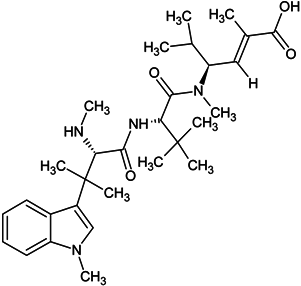 Hemiasterlin is a linear tripeptide isolated from the sponge Hemiasterella minor in 1994. It contains two unique amino acids and exhibited strong cytotoxic activity on the P388 leukaemia cell line [166]. It induces mitotic arrest and apoptosis by blocking mitotic spindle formation and causes tubulin depolymerization [54]. HTI-286 (also known as SPA-110 or taltobulin), a synthetic analogue of hemiasterlin, shows more potent cytotoxic activity than hemiasterlin on human cell lines. The mechanisms of action of both compounds are similar. Preclinical studies showed that HTI-286 inhibited the growth of human tumor xenografts in mice [167]. It has been submitted to phase I clinical trial but unfortunately the results were unsatisfactory. There were no objective responses in patients with advanced solid tumors, besides neutropaenia, nausea, alopecia and pain were observed and further trials were terminated [168]. However, some researchers are still working on this peptide. The combination of antisense oligonucleotides OGX427 and HTI-286 used in therapy intravesically was shown to effectively inhibit orthotopic tumor growth without toxic side effects. The results gave hope to a potential treatment method for bladder cancer [169].