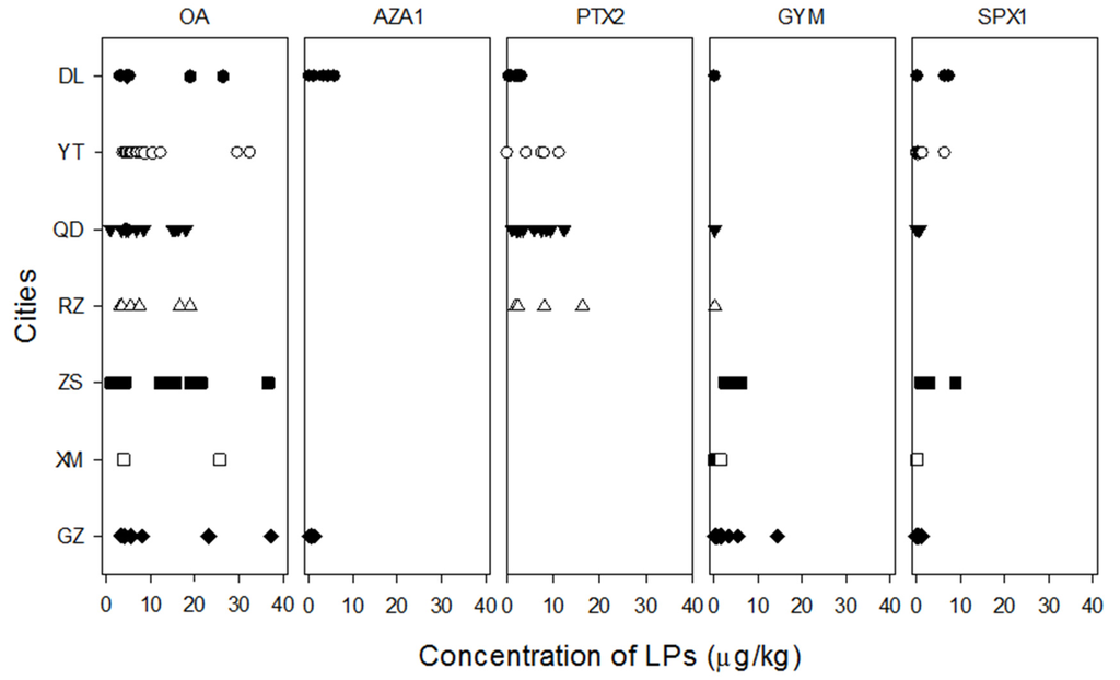 Overall, three distinct patterns of distribution were observed (Figure 3). First, the two cities located in the southernmost (GZ) and northernmost (DL) locales showed a similar trend of lipophilic marine biotoxin contamination. Most of the lipophilic marine biotoxins, except for PTX2 in GZ, were present in a large percentage of specimens from these two cities. GYM was present in ~50% of samples from GZ, and the maximum level (14.4 μg/kg) was found here. The maximum concentration of OA (37.3 μg/kg) also occurred in this city. AZA1 was detected in shellfish at a maximum concentration as 5.90 μg/kg from DL. The presence of AZA and its microalga producer A. poporum along the coast of China [11] might mean that this toxin is now a new risk to consumers. However, the prevalence and concentration of AZA1 were much lower than those of the other lipophilic shellfish toxins.