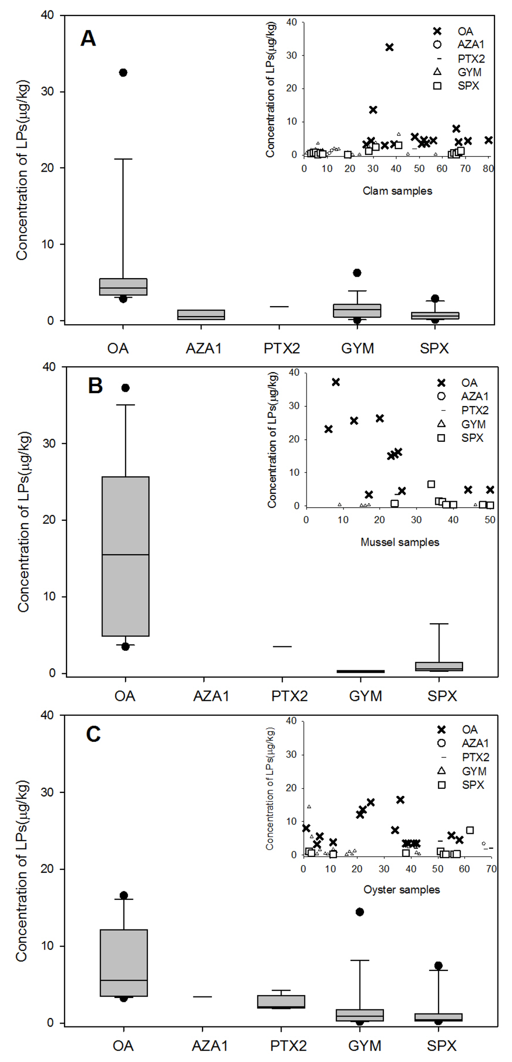 In this study, the prevalence of five different lipophilic shellfish toxins (OA, AZA1, PTX2, GYM, and SPX1) along the Chinese coast was studied. Shellfish samples (clams/cockles, oysters, scallops and mussels) were collected monthly from coastal city markets from December 2008 to December 2009. The goals of this study were to provide a basic understanding of the current contamination situation of shellfish products in China and to provide data for the establishment of a monitoring program and market access system.