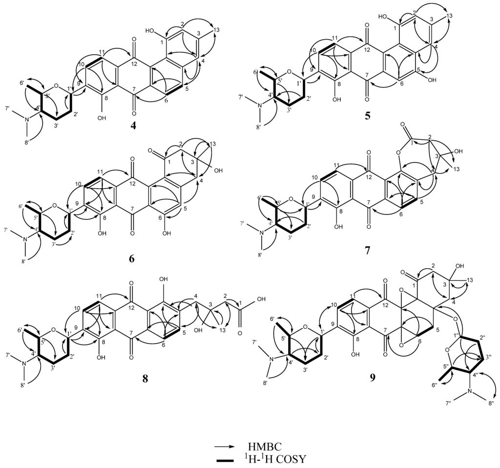 Key 1H–1H COSY and HMBC correlations of compounds 4–9.