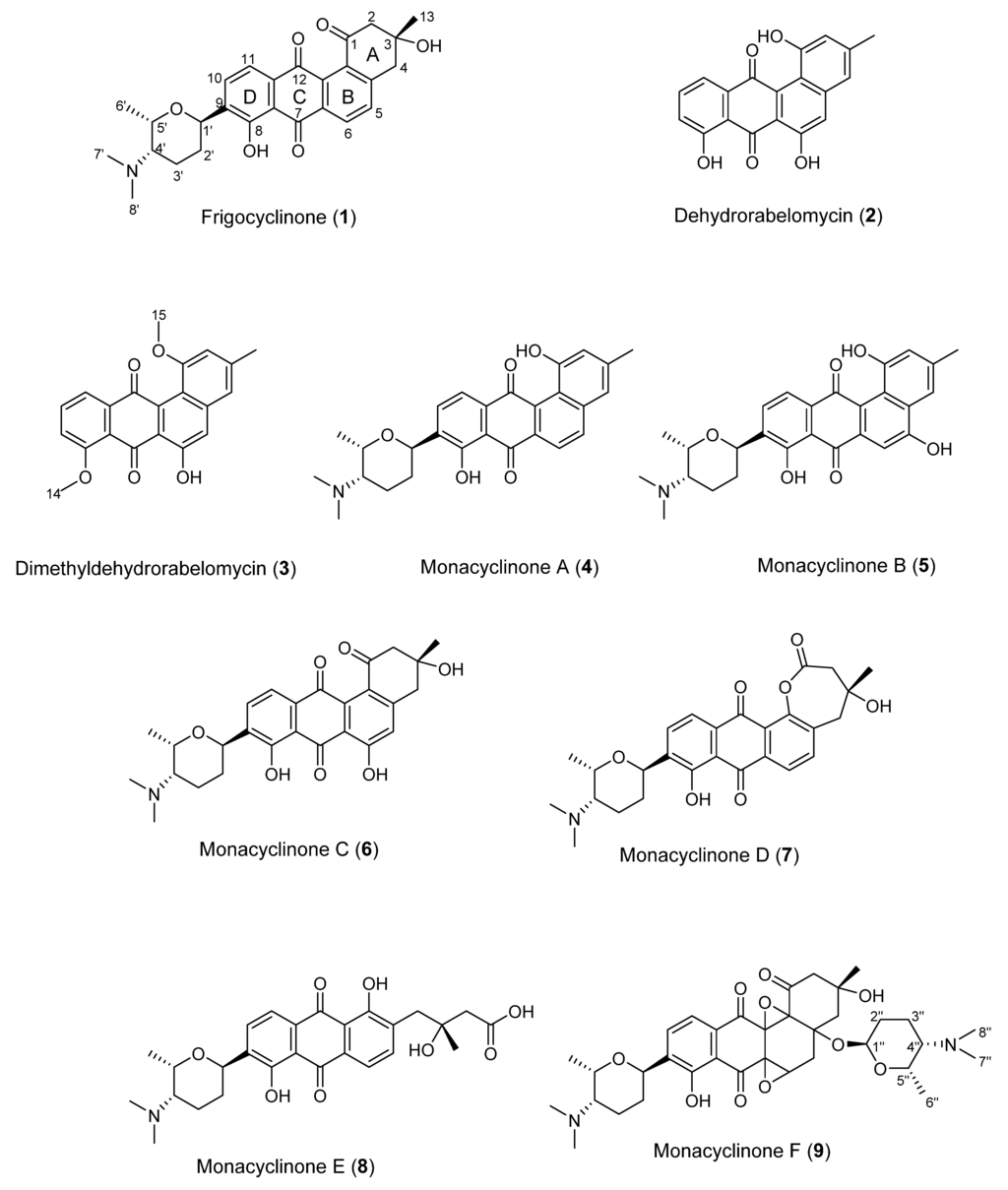 - Bruntner, C.; Binder, T.; Pathom-aree, W.; Goodfellow, M.; Bull, A.T.; Potterat, O.; Puder, C.; Hörer, S.; Schmid, A.; Bolek, W. Frigocyclinone, a novel angucyclinone antibiotic produced by a Streptomyces griseus strain from Antarctica. J. Antibiot. 2005, 58, 346–349. [Google Scholar] [CrossRef] [PubMed]