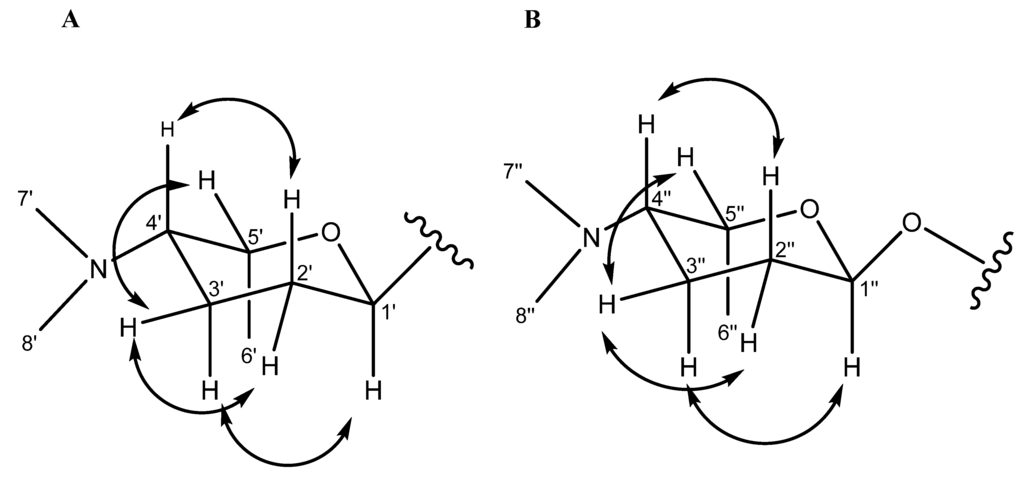 ROESY correlations for the C-linked aminodeoxysugar of compounds 4–8 (A) ROESY correlations for the O-linked aminodeoxysugar of compound 9 (B).