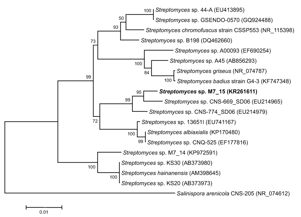 The closest relative to Streptomyces sp. M7_15 searched through GenBank was Streptomyces sp. CNS-669-SD06 with a supporting 98% sequence homology of a partial sequence of the 16S rRNA gene (Figure 4). This suggests the possibility that Streptomyces sp. M7_15 is a new phylotype [23] with the ability to produce new compounds, and in fact six new compounds related to frigocylinone were isolated from the EtOAc extract of the fermentation broth (Figure 2). Since frigocyclinone was previously isolated from a Streptomyces griseus species associated with soils of Antarctica, its partial 16S rRNA sequence was used to compare its genomic information to the 16S rRNA gene of Streptomyces sp. M7_15. Intriguingly, when the neighbor-joining tree was analyzed, these two strains were grouped into two separate clusters, showing a significantly distant relationship to one another (Figure 4). Therefore, it could be assumed that Streptomyces sp. M7_15 is a new actinomycete phylotype that has evolved similar biosynthetic genes to the Antarctic strain of S. griseus or that the presence of the pathways leading to angucyclinone production in one or both strains resulted from horizontal transfer and the two pathways have a common ancestor [24,25,26]. Distinguishing these two possibilities would require sequencing both pathways.