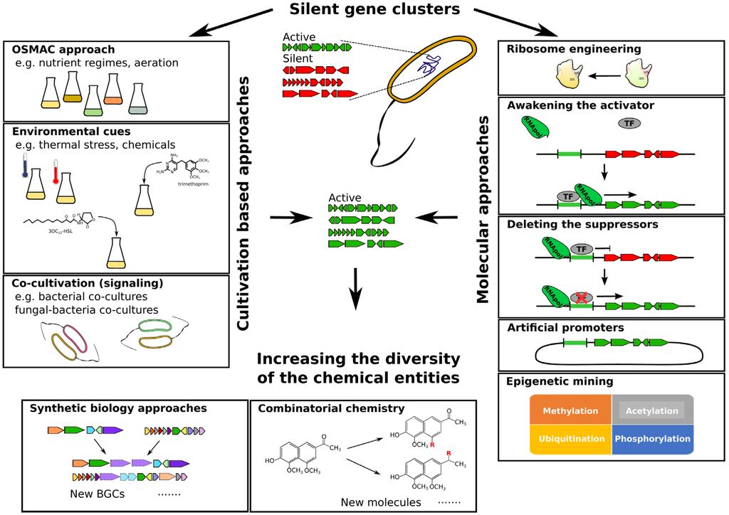 - Ochi, K.; Hosaka, T. New strategies for drug discovery: Activation of silent or weakly expressed microbial gene clusters. Appl. Microbiol. Biotechnol. 2013, 97, 87–98. [Google Scholar] [CrossRef] [PubMed]