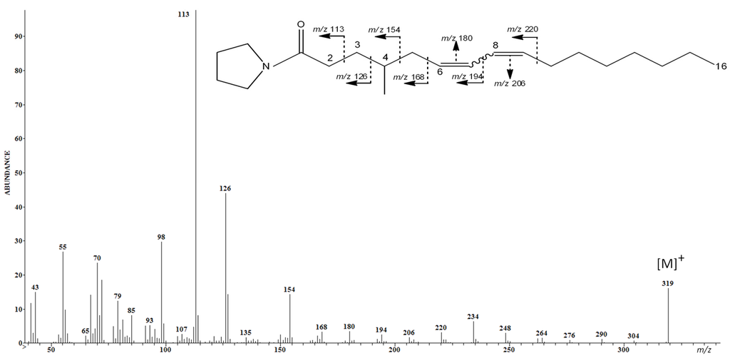 Three isomers (A, B, and C) of the unusual CFA, the 4-Me-6,8-16:2 acid, have been identified based on their chromatographic behavior, the analysis of their FAME and their NAP spectra. Figure 1 shows the NAP spectrum of the isomer C. A molecular ion peak at m/z 319 [M]+ confirmed the heptadecadienoic structure. A diminished peak corresponding to the fragment at m/z 140 [M-179]+ flanked by an elevated peak corresponding to the fragment at m/z 154 [M-165]+ indicated a methyl branch at the fourth carbon. The conjugated diene system (Δ6,8) was located at C6-C7, and C8-C9 where a difference of 12 in m/z ratios was observed between each couple of those carbons. Isomers A and B of 4-Me-6,8-16:2 acid were present in low amounts, less than 2% of total FA. The third-one was present in higher amount in TG (20%), which implies that it could be a storage FA [22].