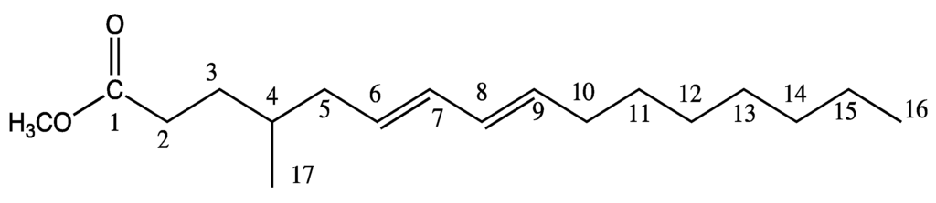Chemical structure of 4-Me-6E,8E-16:2 methyl ester.