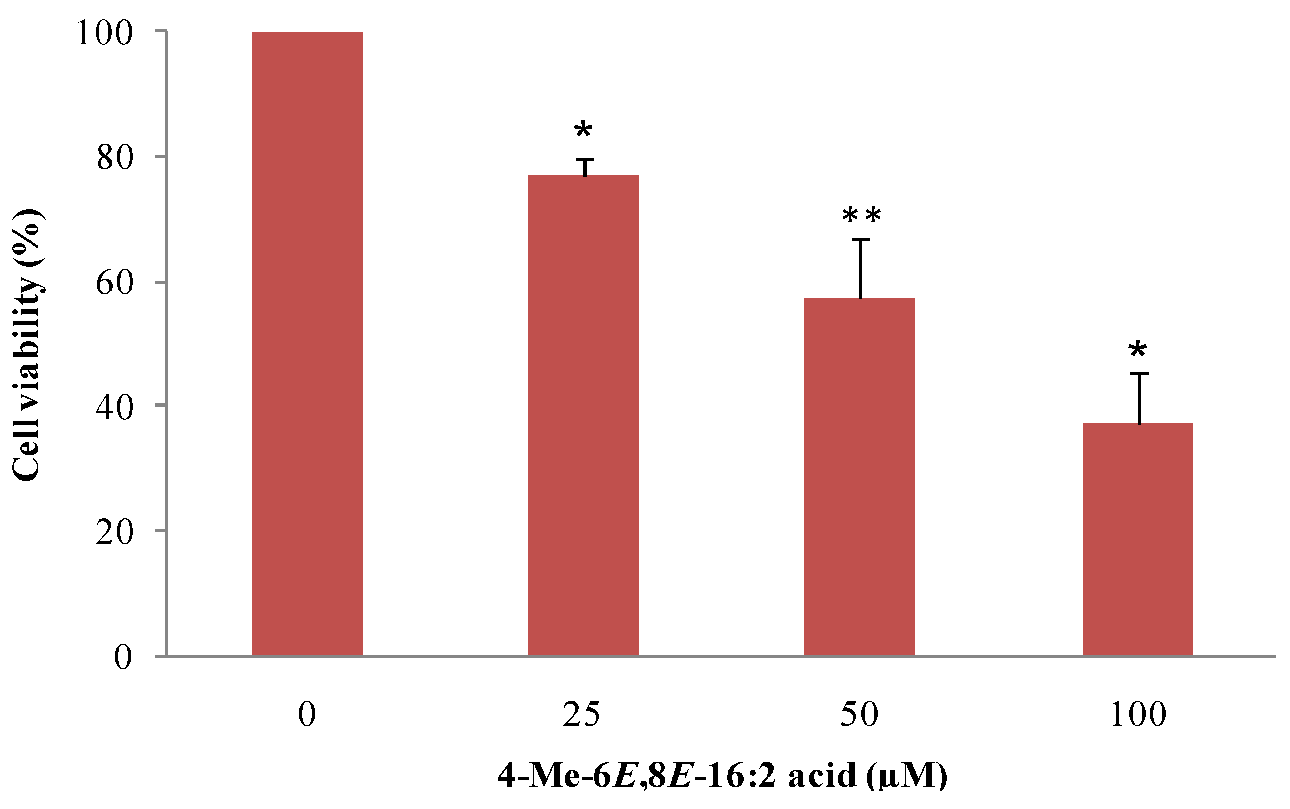 2.3. 4-Me-6E,8E-Hexadecadienoic Acid Reduces Viability of Human MCF-7 Breast Cancer Cells