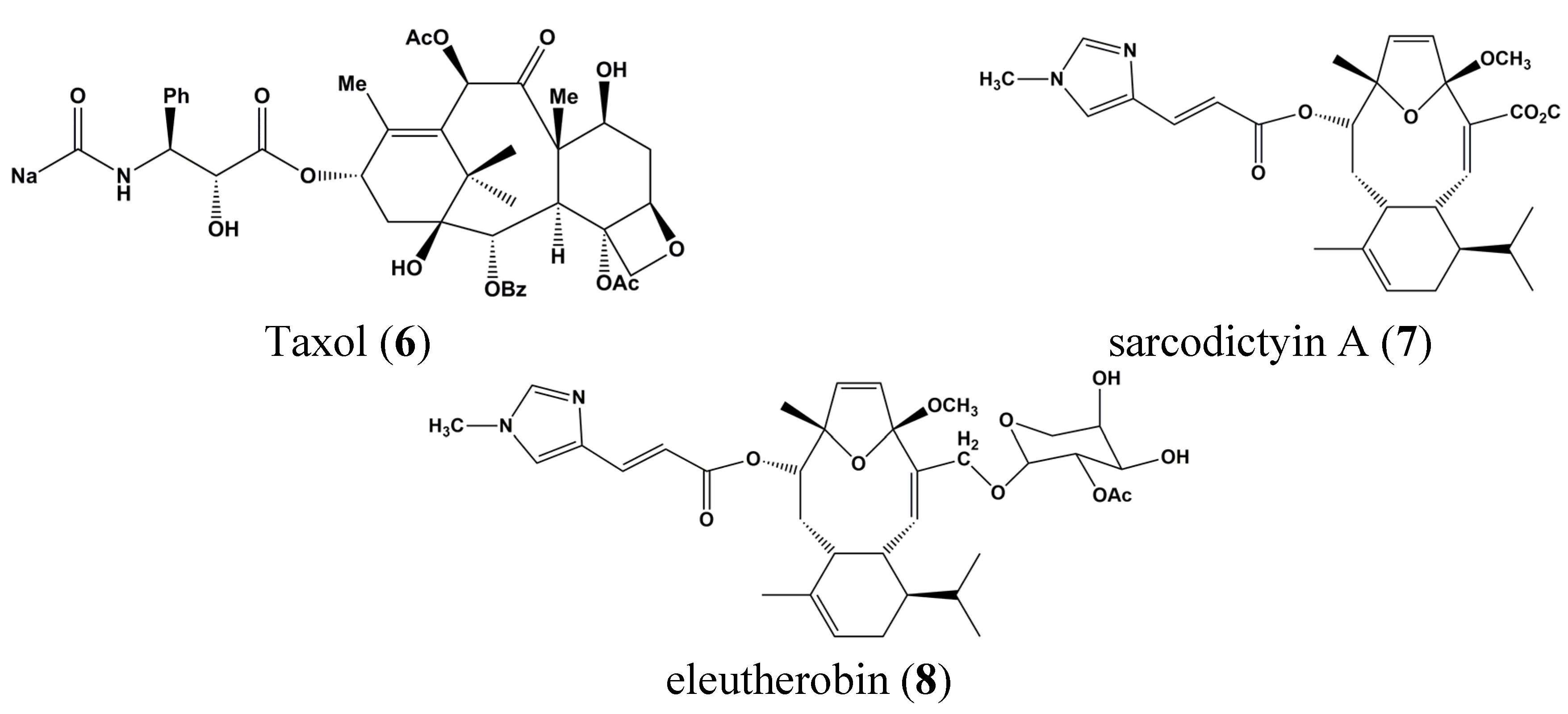 Chemical structures of Taxol (6), sarcodictyin A (7) and eleutherobin (8).