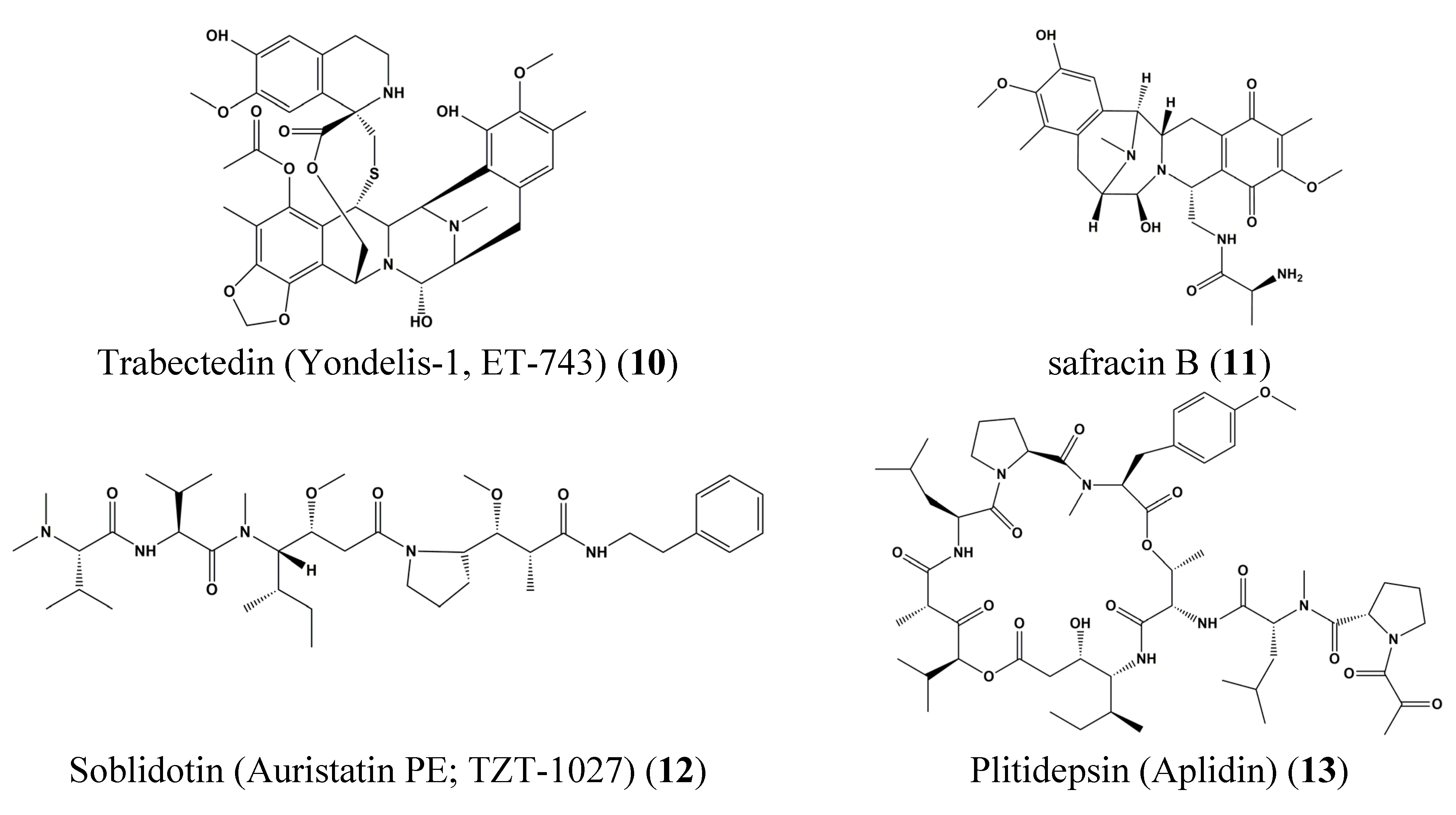 Chemical structures of Trabectedin (Yondelis-1, ET-743) (10), Safracin B (11), Soblidotin (Auristatin PE; TZT-1027) (12) and Plitidepsin (Aplidin) (13).
