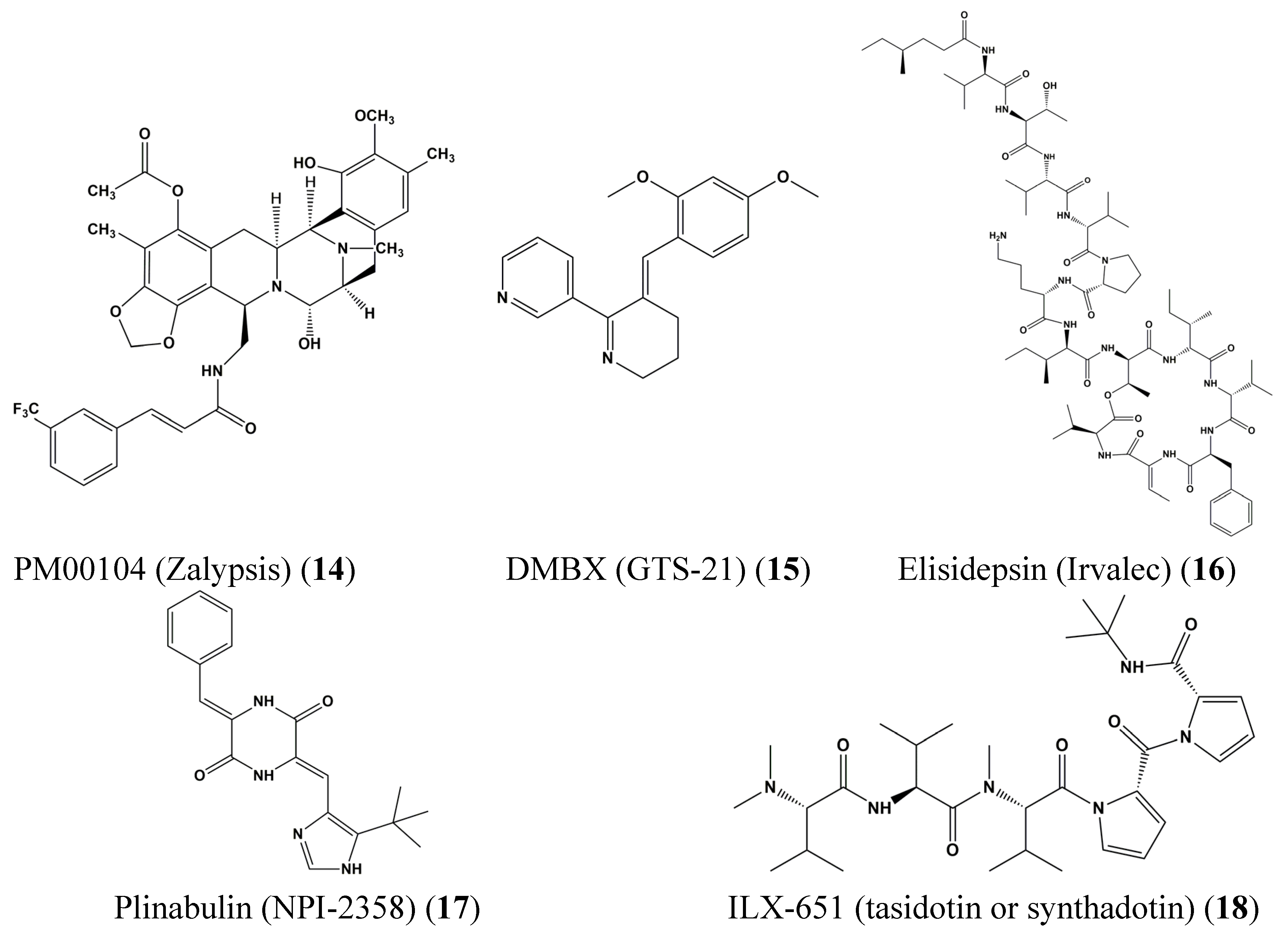 Chemical structures of PM00104 (Zalypsis) (14), DMXBA (GTS-21) (15), elisidepsin (Irvalec, PM02734) (16), plinabulin (NPI-2358) (17) and ILX-651 (tasidotin or synthadotin) (18).