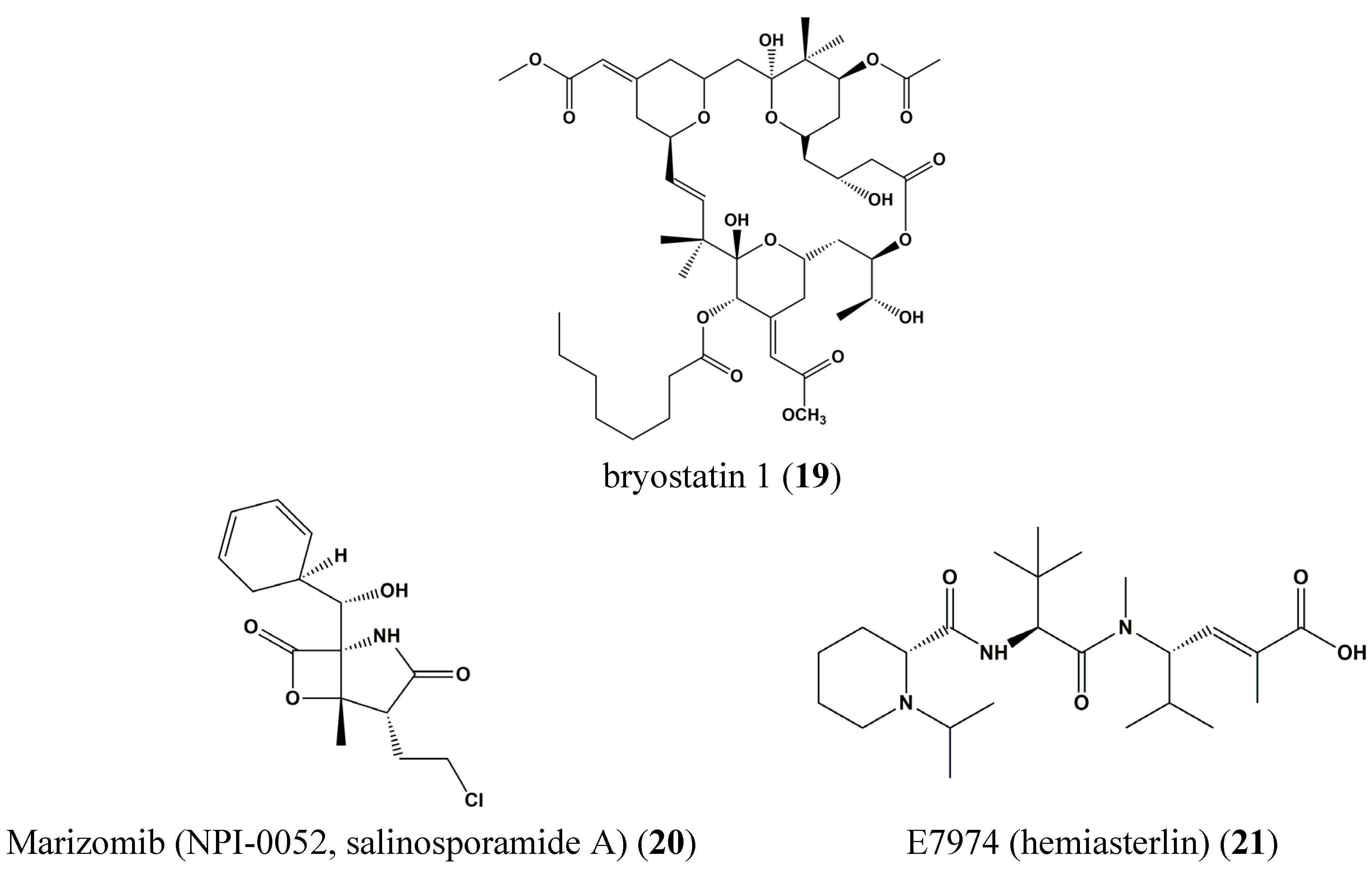 Chemical structures of bryostatin 1 (19), Marizomib (NPI-0052, salinosporamide A) (20) and E7974 (hemiasterlin) (21).