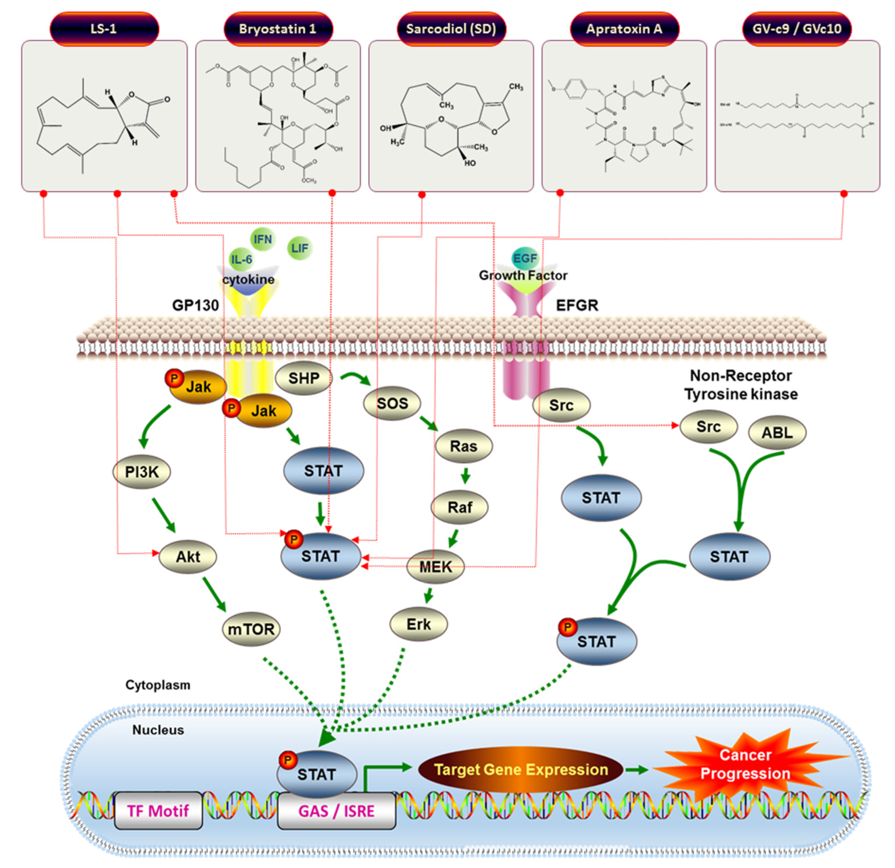 Schematic models for JAK/STAT cell signaling pathway and the inhibitory actions for JAK/STAT target anticancer drugs.