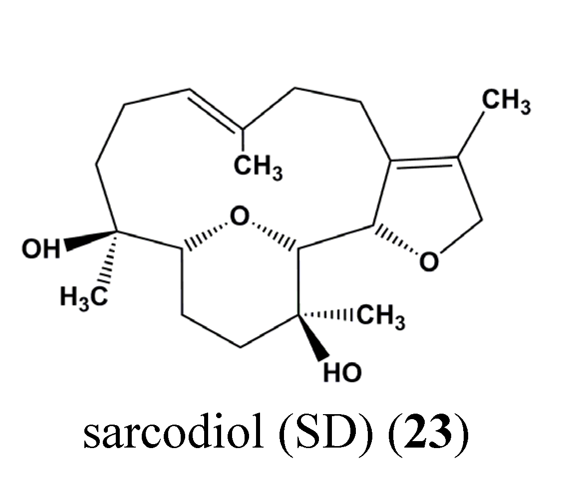 Sarcodiol (SD) (23) (Figure 9) is a semi-synthetic derivative of sarcophine, a marine natural product. The authors show that SD (23) inhibits the de novo DNA synthesis and enhances fragmentation of DNA. Interestingly, SD (23) inhibits the expression levels of STAT-3 and cyclin D1. SD (23) treatment also enhances cellular levels of tumor suppressor protein 53 (p53) and induces caspase-dependent cell death mechanisms [84].