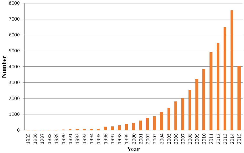 Chitosan is composed of β-(1-4)-linked d-glucosamine and N-acetyl-d-glucosamine randomly distributed within the polymer. The cationic nature of chitosan is rather special, as the majority of polysaccharides are usually either neutral or negatively charged in an acidic environment. This property allows it to form electrostatic complexes or multilayer structures with other negatively charged synthetic or natural polymers [2]. The interesting characteristics of chitosan such as biocompatibility, non-toxicity, low allergenicity and biodegradability allow it to be used in various applications [3]. Besides, chitosan is reported to have other biological properties, such as antitumor [4], antimicrobial [5], and antioxidant [6] activities. The degree of deacetylation, which is described by the molar fraction of deacetylated units or percentage of deacetylation, and the molecular weight of chitosan, were found to affect these properties [7]. Chitosan has been widely used for different biological and biomedical applications recently due to its unique properties. For instance, it can be used in water treatment [8], wound-healing materials [1], pharmaceutical excipient or drug carrier [9], obesity treatment [10] and as a scaffold for tissue engineering [11]. There is increased interest in pharmaceutical as well as biomedical applications of chitosan and its derivatives and significant development has been achieved. It can be reflected in the increasing number of related publications throughout the years. Figure 1 shows the number of Scopus indexed publications from 1985 to June 2015 related to chitosan and its derivatives.