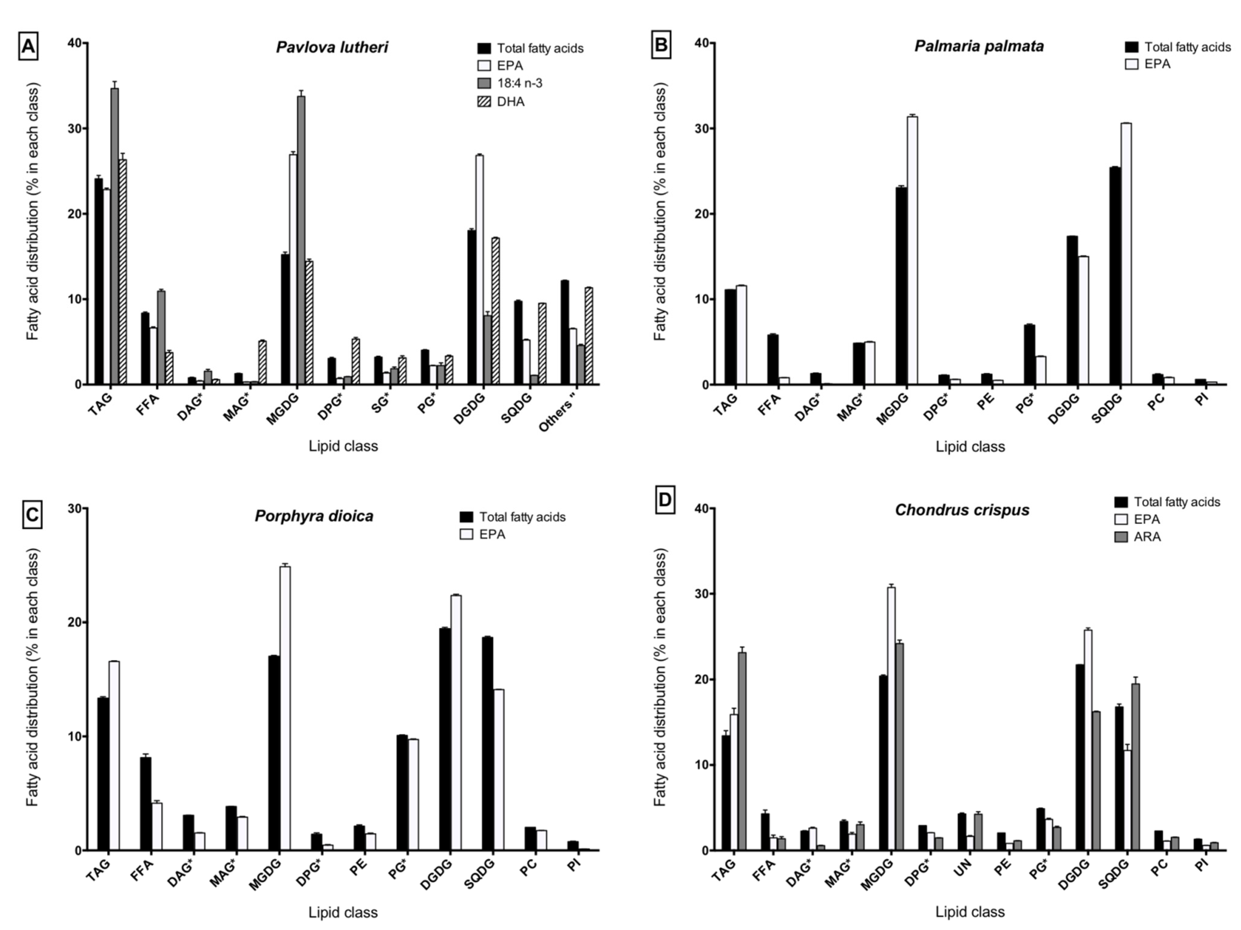 Distribution of fatty acids within lipid classes in (A) Pavlova lutheri; (B) Palmaria palmata; (C) Porphyra dioica; (D) Chondrus crispus. * Identified using Rf values from the literature using similar migration solvent systems without using standards; " Sum of other unidentified polar lipids, i.e., phospholipids and betaine lipids; No symbol: Identified using Rf values from the literature and standards; EPA: eicosapentaenoic acid; DHA: docosahexaenoic acid; TAG: triacylglycerol; FFA: free fatty acids; DAG: diacylglycerols; MAG: monoacylglycerols; MGDG: monogalactosyldiacylglycerols; DPG: diphosphatidylacylglycerols; SG: acylated sterol glycosides; PE: phosphatidylethanolamines; PG: phosphatidylglycerols; DGDG: digalactosyldiacylglycerols; SQDG: sulfoquinovosyldiacylglycerols; PC: phosphatidylcholines; PI: phosphatidylinositols; UN: unidentified.