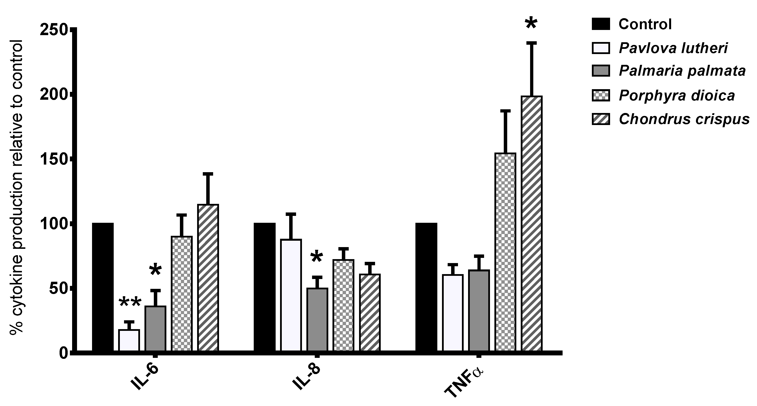 The effects of THP-1 macrophage exposure to the four algal lipid extracts on lipopolysaccharide (LPS)-stimulated IL-6, IL-8 and TNFα production are shown in Figure 2. Following 24 h-exposure to P. lutheri lipid extract, the production of the pro-inflammatory cytokine IL-6 (p < 0.01) was significantly downregulated in comparison to the carrier control. Incubation of the THP-1 cells with P. palmata lipid extract significantly reduced production of IL-6 (p < 0.05) and IL-8 (p < 0.05), whereas incubation with C. crispus lipid extract led to significantly increased production of TNFα relative to the carrier control (p < 0.05). P. dioica did not appear to significantly influence the production of any of the examined cytokines. There were no significant responses in IFNγ IL-12p70, IL-10 or IL-1β production by THP-1 cells following exposure to any of the algal lipid extracts.