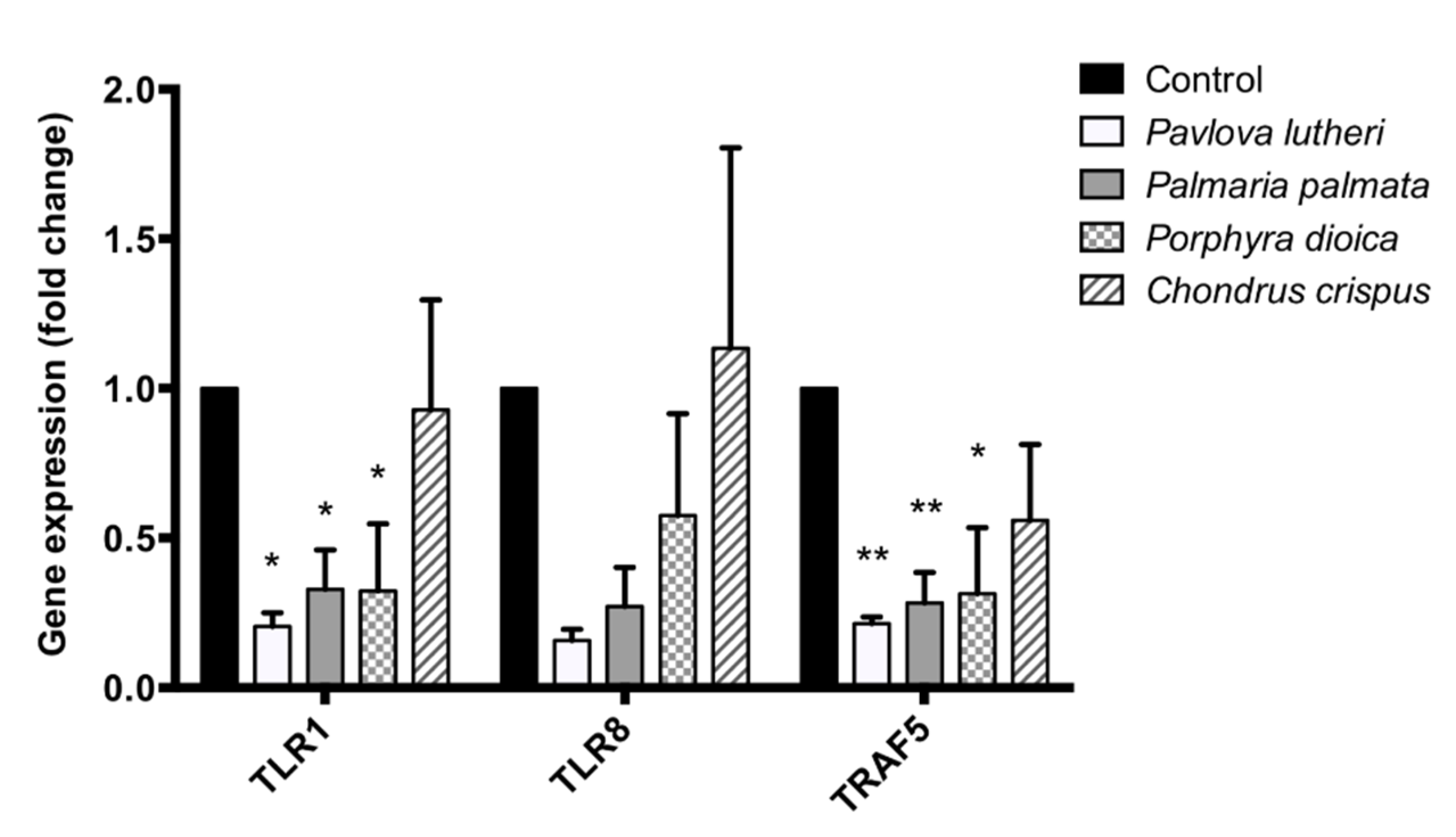 | P. lutheri | TLR8 | Toll-like receptor 8 | −3.33 | PAMP recognition and activation of innate immunity. Mediates cytokine production through activation of NF-κB |
