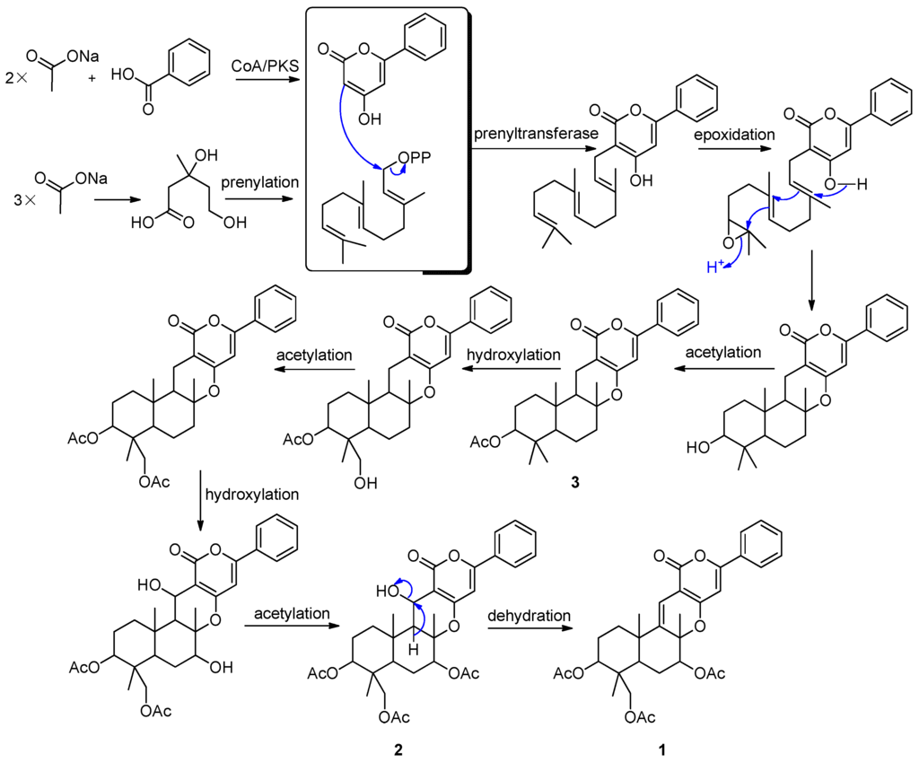 Tomoda et al. described the biosynthetic origin of pyripyropene A (5), which was established by feeding experiments using various [13C] and [14C] precursors. Pyripyropene A (5) is derived from three mevalonates, five acetates and one nicotinic acid. The pyridino-α-pyrone moiety is produced via condensation of a primer nicotinic acid with two acetates in a “head-to-tail” fashion; an all-trans farnesyl pyrophosphate is produced via the mevalonate pathway; the two parts are linked and cyclized to form the core skeleton, and then three acetyl residues from the acetates are introduced into the skeleton to yield 5 [28]. Based on the above finding, we proposed that the phenyl-α-pyrones (1–3) shared a similar biosynthetic pathway (Figure 5). Benzoic acid, instead of nicotinic acid, is one of the precursors. It is very interesting that Compound 2 was observed slowly changing into Compound 1 when stored in DMSO-d6. The change was recorded by 1H-NMR spectra. After 18 days, Compound 2 was changed into Compound 1 thoroughly. However, the pure Compounds 1 and 2 are stable at the temperature range from −20 °C–90 °C.