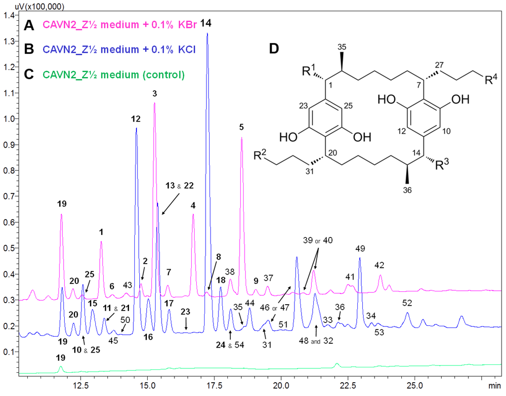 Overlay of HPLC-UV chromatograms (λ = 226 nm) of extracts from Nostoc sp. CAVN2 cultures grown in the presence of 0.1% KBr (A) or 0.1% KCl (B) for 30 days versus the control (C). (D) Carbamidocyclophane and cylindrocyclophane core structure. Specific substitution patterns of identified compounds and structural proposals of non-elucidated derivatives are listed in Table 1.