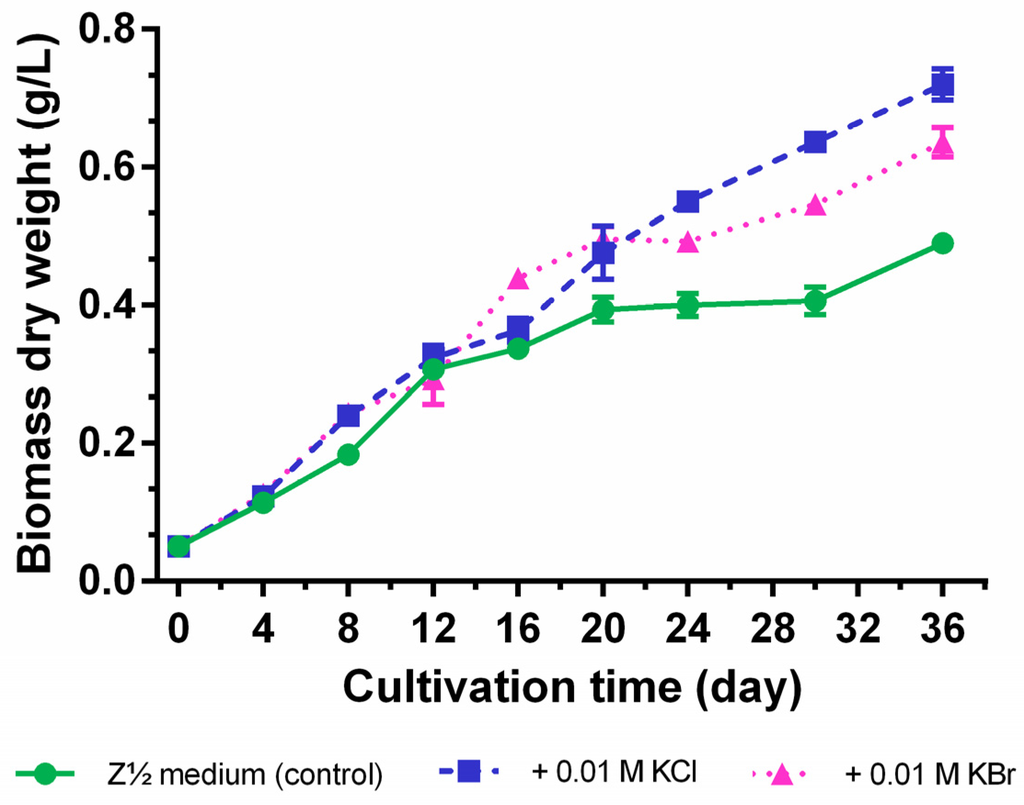 Total [7.7]paracyclophane amounts of Nostoc sp. CAVN2 cultures grown in the presence of different potassium halide salts at varying concentration levels for 20‒30 days. Values shown are expressed as the mean ± standard error of the mean (SEM), n = 2.