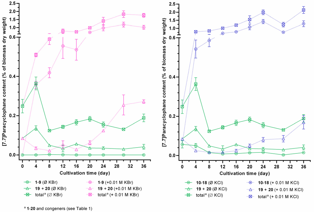 However, the total average [7.7]paracyclophane amounts generally correlated positively with increasing halogen salt concentrations and cultivation time. Especially by addition of chloride and bromide, highest compound production was observed in cultures supplemented with 0.1% of these halide salts after 30 days, which means an up to 44-fold and 28-fold, respectively, increase of the [7.7]paracyclophane quantity compared to the unspiked control samples (Figure 1).