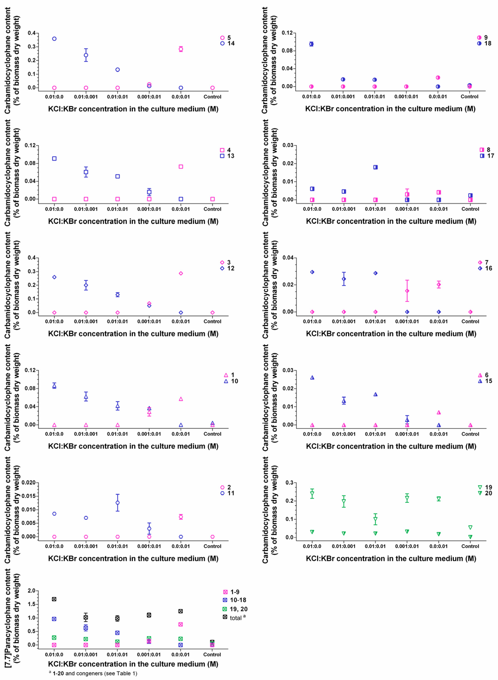 Our initial screening data revealed that the unknown halogenase involved in [7.7]paracyclophane biosynthesis of Nostoc sp. CAVN2 can utilize chloride as well as bromide as the halide substrate. This is in agreement with results of previous studies on halogenated natural products, for which an involvement of FADH2-dependent halogenases is discussed, e.g., for chloramphenicol [23], chlortetracycline [22], pyrrolnitrin [26], and balhimycin [30], and seems to be widespread among this class but has also been reported for other halogenating enzymes [39,40]. Thus, we investigated the growth and the compound biosynthesis in the presence of KBr and KCl in detail with an emphasis on the quantification of every single carbamidocyclophane 1‒20 to evaluate the halide preference of the halogenating enzyme on the metabolic level.