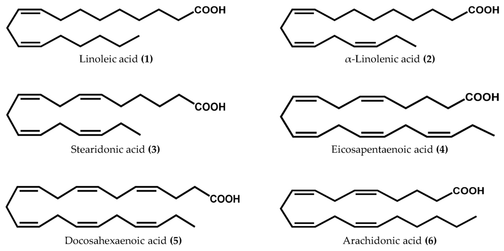 Macroalgae comprise an abundant and heterogeneous group of marine organisms characterized by their photosynthetic nature and worldwide distribution [12]. Biodiversity within red (Rhodophyta), green (Chlorophyta), and brown (Ochrophyta) macroalgae offers the possibility of finding a wide variety of natural compounds with interesting properties [13]. Among the great chemical diversity, macroalgae are unanimously acknowledged as the main primary producers of PUFA. Some major algal PUFA, including the human-essential linoleic (1) and α-linolenic (2) acids, as well as stearidonic (3), eicosapentaenoic (4), and docosahexaenoic (5) acids (Figure 1), are not only important membrane components, but may also be involved in the regulation of physiological processes, by serving as precursors in the biosynthesis of a multitude of structurally unique oxylipins [14,15,16,17,18,19,20,21,22,23,24]. Surprisingly, in several cases the abundance of PUFA substrates does not closely parallel their use in oxylipin biosynthetic pathways. For instance, macroalgae belonging to the Ochrophyta phylum are relatively depauperate in C18 PUFA; however, they commonly utilize this substrate in LOX-initiated biosynthetic pathways. Chlorophyta, like higher terrestrial plants, mainly oxidizes C18 substrates, while Rhodophyta seems to fully utilize C18 and C20 PUFA for oxylipin generation [3].