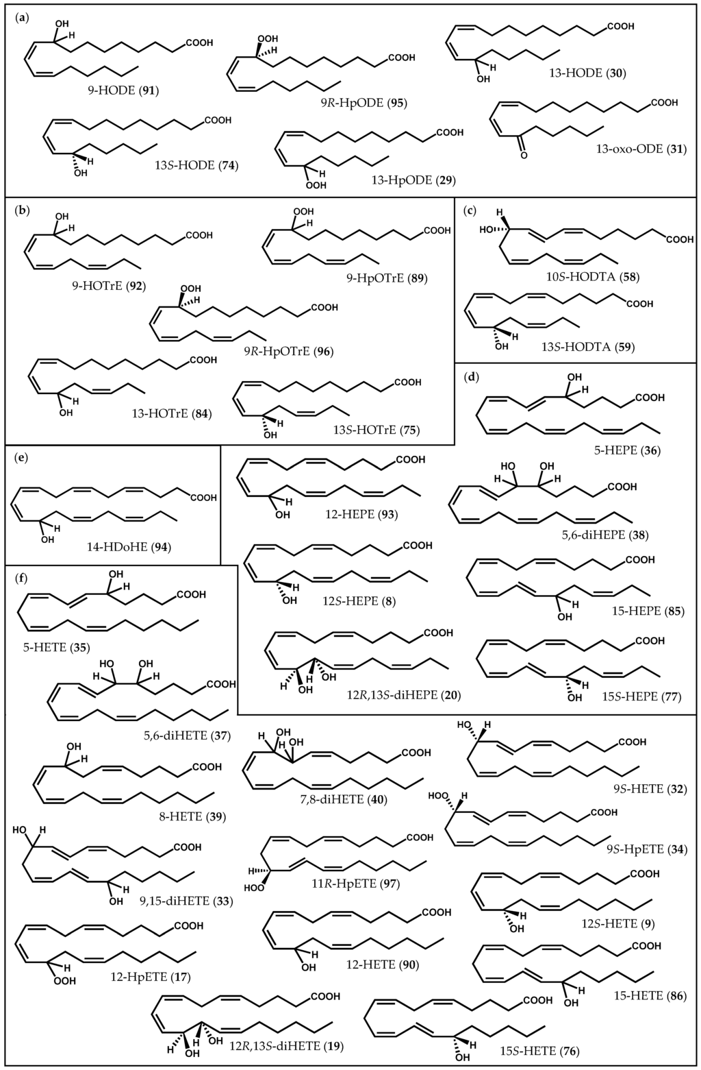 Chemical structures of some common oxylipins described in macroalgae: (a) linoleic acid derivatives; (b) α-linolenic acid derivatives; (c) stearidonic acid derivatives; (d) eicosapentaenoic acid derivatives; (e) docosahexaenoic acid derivatives; (f) arachidonic acid derivatives.