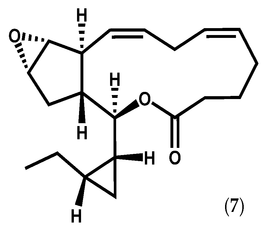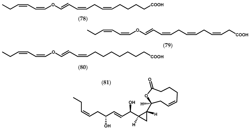 Moreover, three divinyl ether-fatty acids (78–80, Figure 13) were found in L. sinclairii, which are indicative of a LOX with ω6 specificity. Later, the analysis of an extract from L. sinclairii led to the isolation of neohalicholactone (81, Figure 13), a cyclopropyl-containing oxylipin firstly isolated from the marine sponge Halichondria okadai Kadota [105].