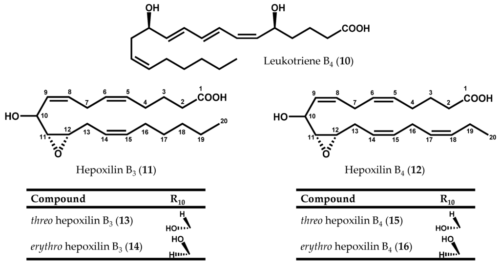Chemical structures of leukotriene B4, and hepoxilins B3 and B4 diastereoisomers.
