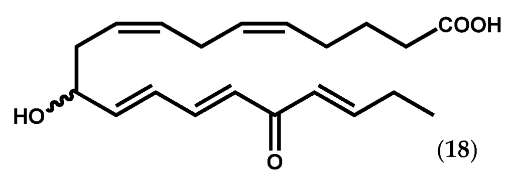 Although extensive detail about oxylipin occurrence in microalgae is beyond this review, some important features of oxylipin metabolism in these unicellular organisms cannot be discarded. A characteristic difference from macroalgae is the complete absence of C18 PUFA-derived LOX products in several species of diatom microalgae [2]. Diatoms, which have emerged as an independent lineage quite recently in the evolution of photosynthetic eukaryotes, use eicosapentaenoic acid (4) and chloroplastic C16 fatty acids as substrates for oxylipin assembly [53]. Furthermore, only a few additional accounts of oxylipins from other microalgae classes have been addressed, most of which are restricted to common hydroxy-fatty acid derivatives [54,55,56,57,58,59,60].