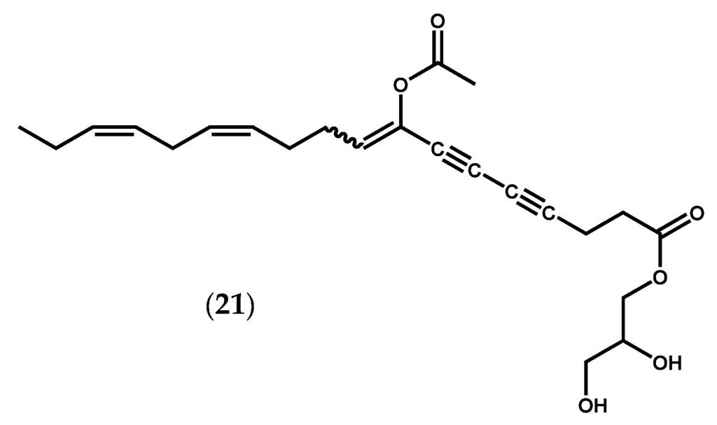 Other three homologous oxylipins produced by a 12-LOX pathway were isolated from Farlowia mollis (Harvey & Bailey) Farlow & Setchell and structurally elucidated by spectrochemical methods [79]. Two of them, 12R,13S-dihydroxyeicosatetraenoic acid (12R,13S-diHETE) (19, Figure 2f) and 12R,13S-dihydroxyeicosapentaenoic acid (12R,13S-diHEPE) (20, Figure 2d), as well as other oxylipins, were also detected in G. lemaneiformis [16,71,80]. Hamberg & Gerwick [80] reported the presence of additional enzymatic activity, other than LOX, in G. lemaneiformis, an AOS that catalyzes the conversion of 12-HpETE (17) into 12R,13S-diHETE (19) [80]. The two vicinal diol-fatty acids 12R,13S-diHETE (19) and 12R,13S-diHEPE (20) also displayed interesting biological properties, including inhibition of 5-LOX in A23187-stimulated human polymorphonuclear leukocytes (38% inhibition at 10−4 M) and of dog kidney Na+/K+ ATPase (54% inhibition at 10−4 M) [79]. Other remarkable biological effects have been described for unique oxylipins. Peyssonenynes A and B (21, Figure 6), firstly isolated in 2004 from the Fijian red marine alga Peyssonnelia caulifera Okamura, were roughly equipotent on in vitro inhibition of DNA methyl transferase 1 (DNMT1) (IC50 values of 16 and 9 µM, respectively) [81]. Selective DNMT inhibitors might rapidly reactivate the expression of epigenetically-silenced tumor suppressor genes, and this reactivation could lead to growth inhibition of tumor cells or alteration of their sensitivity to other anticancer therapies. Two DNMT inhibitors (5-aza-cytidine, Vidaza®, 5-aza-2′-deoxycytidine, Dacogen®) are already in use for the treatment of myelodysplastic syndrome. However, these drugs are cytotoxic azanucleosides, and novel inhibitors with alternative mechanisms of action are actively sought [82]. Once peyssonenynes (21) are rare in red algae, researchers have already accomplished their total synthesis and other functional assays are being conducted [82,83].