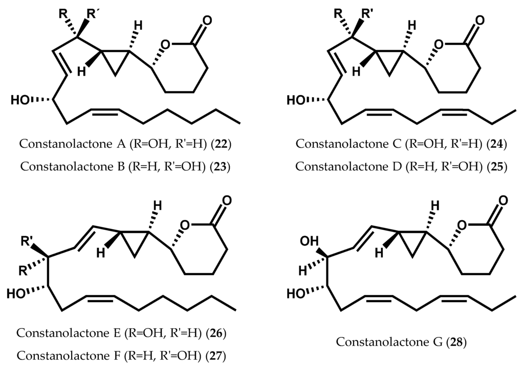 - Nagle, D.G.; Gerwick, W.H. Structure and stereochemistry of constanolactones A–G, lactonized cyclopropyl oxylipins from the red marine alga Constantinea simplex. J. Org. Chem. 1994, 59, 7227–7237. [Google Scholar] [CrossRef]