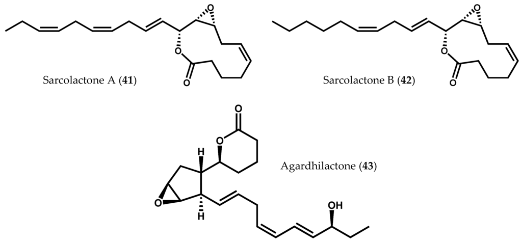 Examples of 8-LOX activity have also been described in several species of Rhodophyta, including Sarcodiotheca gaudichaudii (Montagne) P.W. Gabrielson [90], Agardhiella subulata (C. Agardh) Kraft & M.J. [91], Gracilaria chilensis C.J. Bird, McLachlan & E.C. Oliveira [27], and Gracilaria vermiculophylla (Ohmi) Papenfuss [31]. Besides the presence of common fatty acid derivatives, such as 8-hydroxyeicosatetraenoic acid (8-HETE, 39) and 7,8-dihydroxyeicosatetraenoic acid (7,8-diHETE, 40), some unique carbocyclic oxylipins with an 8-LOX precedence were also identified (Figure 2f) [31,90,91]. Two members of the same family (Solieriaceae), S. gaudichaudii and A. subulata, provided sarcolactones A (41) and B (42) [90], and agardhilactone (43) [91], respectively, from 8-LOX metabolism (Figure 8). Sarcolactone A (41) and agardhilactone (43) are closely related metabolites, envisioning a common intermediate for these carbocyclic oxylipins [91]. Nylund et al. [31] isolated 8-HETE (39) and 7,8-diHETE (40), as well as novel conjugated lactones and traces of leukotriene B4 (10), from mechanically wounded tissues of G. vermiculophylla [31]. Lion et al. [27] had previously studied the response of G. chilensis (a noninvasive alga closely related to the invasive species G. vermiculophylla) to wounds, reporting the production and release of 8-HETE (39) and 7,8-diHETE (40) after tissue disruption [27]. The upregulation of these oxylipins, particularly of 7,8-diHETE (40), in wounded algae suggests that both G. vermiculophylla and G. chilensis respond similarly to tissue damage. The two algae species rely then on a conserved defense mechanism (rapid LOX-mediated transformation of arachidonic acid (6) to structurally diverse oxylipins against herbivory), the invasive potential of G. vermiculophylla being partly explained by the exclusive detection of prostaglandins in this species [33].