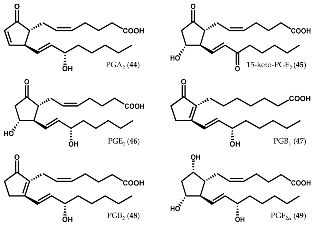 The occurrence of prostaglandins (Figure 9) was primarily reported in the Gracilaria genus; however, prostaglandin A2 (PGA2, 44) and 15-keto-PGE2 (45), a stable derivative of PGE2 (46), were also synthesized in vivo by C. crispus gametophytes treated with 50 or 100 µM methyljasmonate for 6 h [29]. In a previous study, PGB1 (47) and PGB2 (48) had not been detected in vivo, but their presence was evidenced in elicited C. crispus upon incubation with arachidonic acid (6) [26]. Gregson et al. [92] reported, for the first time, the presence of PGE2 (46) and PGF2α (49) in Gracilaria lichenoides (J.V. Lamouroux) Greville [92]. Afterwards, other prostaglandins, including PGA2 (44), PGE2 (46), and 15-keto-PGE2 (45) were identified in both Gracilaria verrucosa (Hudson) Papenfuss [93,94,95] and G. vermiculophylla [31,33], along with other fatty acid derivatives. While the prostaglandin-endoperoxide pathway of prostaglandin biosynthesis in invertebrate marine animals has been demonstrated in corals [96,97,98] and in crustaceans [99], the prostaglandin biosynthetic pathway of non-animal organisms has remained unknown for years. Kanamoto et al. [100] have identified the first non-animal prostaglandin endoperoxide H synthase (PGHS) gene in the alga species G. vermiculophylla and cloned it in a prokaryotic expression system for the production of PGF2α (49) [100]. Varvas et al. [101] further characterized the structure and function of G. vermiculophylla PGHS, concluding that this enzyme displays atypical structural and catalytic features [101].