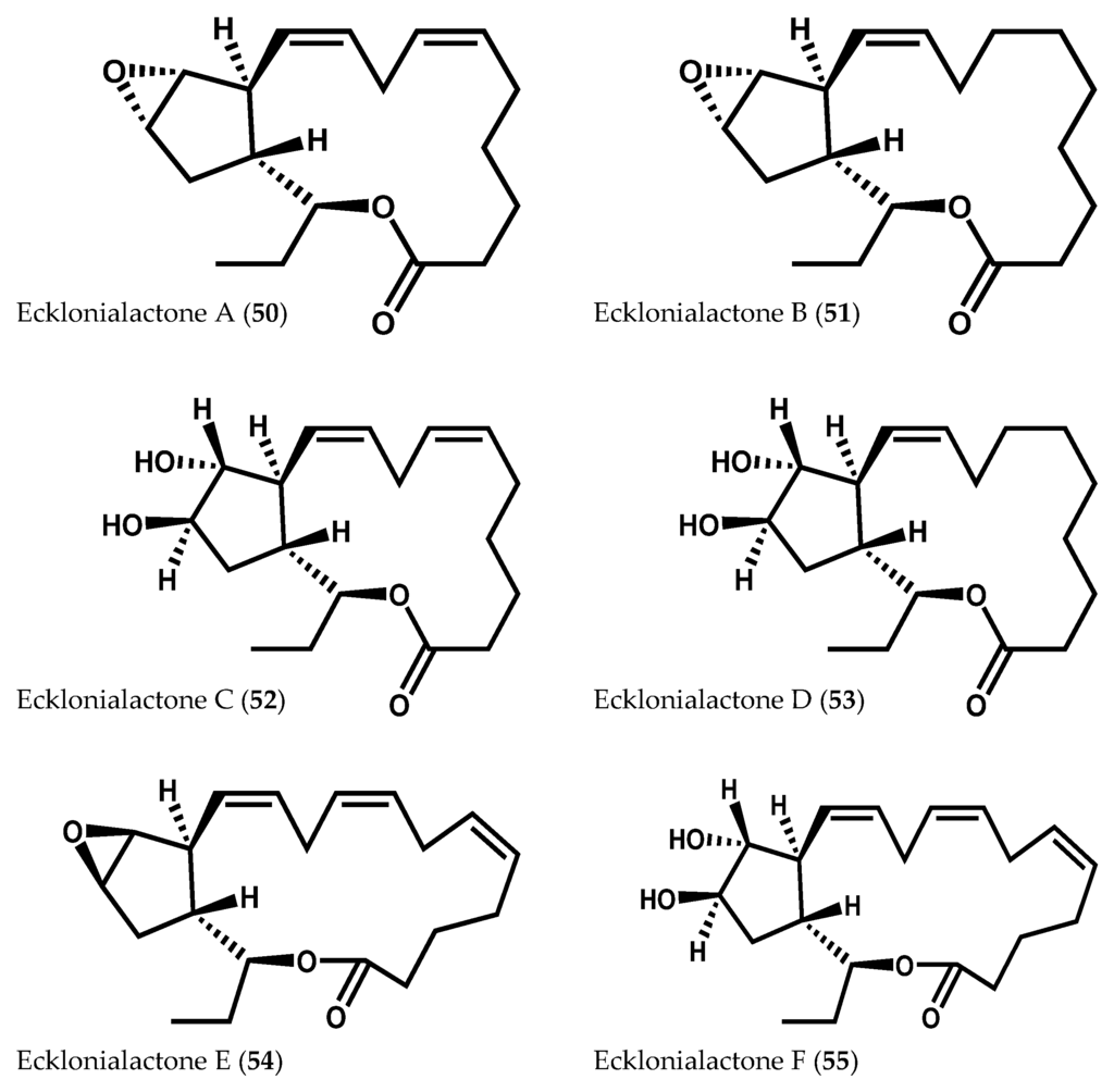 Ecklonialactones A (50) and B (51), C18 tricyclic compounds, were initially isolated from the brown alga Ecklonia stolonifera Okamura as metabolites with invertebrate antifeedant activity against the abalone Haliotis discus hannai Ino (Figure 10) [102]. Later, Kurata and co-workers [103] found another four ecklonialactones (C–F (52–55)) in E. stolonifera (Figure 10) [103]. These same metabolites, along with other related classes of cyclical oxylipins, were also described in Cymathaere triplicata (Postels & Ruprecht) J. Agardh [23,90,104], Egregia menziesii (Turner) Areschoug [19], Laminaria sinclairii (Harvey ex J.D. Hooker & Harvey) Farlow, Anderson & Eaton [105], and Eisenia bicyclis (Kjellman) Setchell [22].