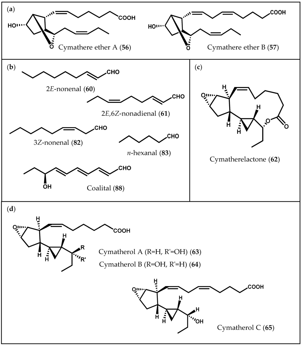 In addition to simpler hydroxylated fatty acids, a series of prostanoid-like metabolites has been isolated from the edible kelp C. triplicata. Proteau and Gerwick [104] began by reporting two bicyclic oxylipins, cymathere ethers A (56) and B (57) (Figure 11a), and proposed 10S-hydroxyoctadecatetraenoic acid (10S-HODTA) (58, Figure 2c) as a biosynthetic intermediate [104]. Further experiments led to the isolation of unique molecules from the extract of C. triplicata, as well as hydroxylated fatty acids: 12S-HETE (9), 13S-hydroxyoctadecatetraenoic acid (13S-HODTA) (59, Figure 2c), and 10S-HODTA (58). Likewise, hydroperoxide cleavage products, such as 2E-nonenal (60) and 2E,6Z-nonadienal (61), responsible for the characteristic odor of fresh alga and believed to be physiologically active, were also found in C. triplicata extracts (Figure 11b) [90]. The elucidation of cymatherelactone (62, Figure 11c) and cymatherols A–C structures (63–65, Figure 11d) was then accomplished by a combination of spectroscopic techniques and synthetic derivatization [23]. These new oxylipins contain cyclopentyl, cyclopropyl, epoxyde, and lactone rings, and all of them are likely to be synthesized from the C18 PUFA stearidonic acid (3), with the exception of cymatherol C (65), which is predicted to derive from eicosapentaenoic acid (4). Moreover, the sodium channel modulating properties of the isolated compounds were evaluated using Neuro-2a cell line: cymatherelactone (62) exhibited moderate sodium channel blocking activity (IC50 = 16 µM) [23].