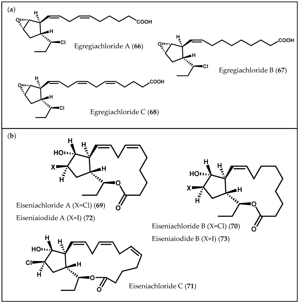 Another class of cyclic oxylipins, the egregiachlorides (Figure 12a), was found for the first time in E. menziesii, along with ecklonialactones A (50), B (51) and E (54), previously described [106]. Egregiachlorides A–C (66–68) are characterized by a cyclopentyl ring with an adjacent chlorine functionality [106]. The occurrence of egregiachlorides A (66) and B (67) was later observed in the brown alga species E. bicyclis [22]. Besides these chlorinated C18 oxylipins, cymathere- and lactone-type oxylipins, as well as novel ecklonialactone derivatives containing either a chloride (eiseniachlorides (69–71)) or an iodide atom (eiseniaiodides, 72 and 73) (Figure 12b), were also described in E. bicyclis [22]. The biogenesis of these metabolites is likely to involve the oxidation of a C18 PUFA catalyzed by 13-LOX, leading to the formation of a 13-hydroperoxide compound, which subsequently undergoes a number of rearrangements. Moreover, Kousaka et al. [22] evaluated the antibacterial capacity of the isolated oxylipins against two bacterial strains (Bacillus subtilis Cohn and Staphylococcus aureus Rosenbach). The halogenated oxylipins displayed a moderate inhibition against both bacteria [22].