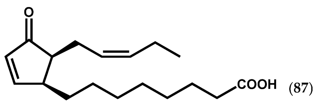 Until 2010, global molecular analyses of brown algal stress response were hampered by the lack of genomic resources. The access to Ectocarpus siliculosus (Dillwyn) Lyngbye genome sequence by Cock et al. [111] represented a major breakthrough in algal research. For instance, although the endogenous occurrence and relevance of jasmonates in macroalgae are still unclear, the presence of AOS and AOC genes involved in the initial step of jasmonates’ biosynthesis, in contrast with the absence of genes for jasmonic acid carboxyl methyl transferase in the Ectocarpus genome, suggested that (i) jasmonates may not have the same function in brown algae as in land plants or (ii) they have evolved to serve similar functions using different regulatory systems [42,88]. In fact, the accumulation of C18 cyclic oxylipins like 12-oxo-phytodienoic acid (12-OPDA) (87, Figure 14), the biosynthetic precursor of jasmonates, as well as of a number of C20 cyclic prostaglandins was described in L. digitata and E. siliculosus under copper stress, supporting the role of putative cyclopentenones in the defensive mechanisms of brown algae [40,42].