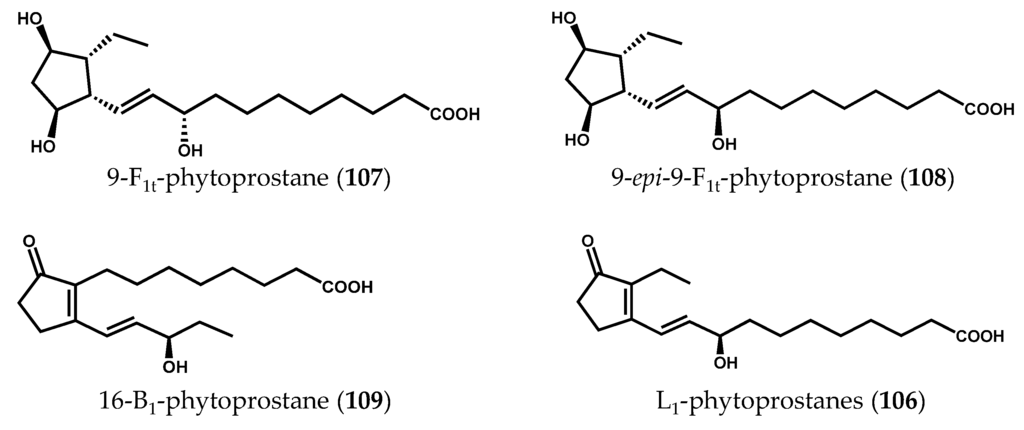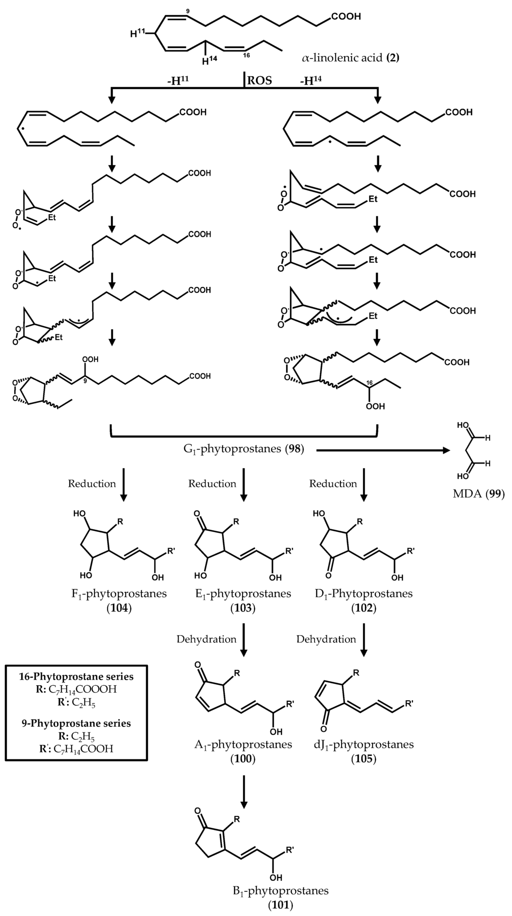 The biosynthesis of phytoprostanes (Figure 15) is proposed to be initiated by the attack of ROS to α-linolenic acid (2), yielding a linolenate radical that readily oxidizes and cyclizes to complex regio- and stereoisomeric prostaglandin-like compounds [124]. Two regioisomeric series (16- and 9-series) can be generated according with the position where the hydrogen abstraction occurs and the oxygen atoms are inserted into the PUFA backbone [125]. G1-phytoprostanes (98) can spontaneously decay, forming malondialdehyde (MDA) (99), or be the precursors of different classes of phytoprostanes, named in analogy with the prostaglandin nomenclature system as A1 (100), B1 (101), D1 (102), E1 (103), F1 (104), dJ1 (105), and L1 (106) phytoprostanes, the latter being the regioisomer of B1-phytoprostanes (101) [126]. Thus, a myriad of oxygenated lipids is generated, some of which remain anchored in membranes, while others are released.